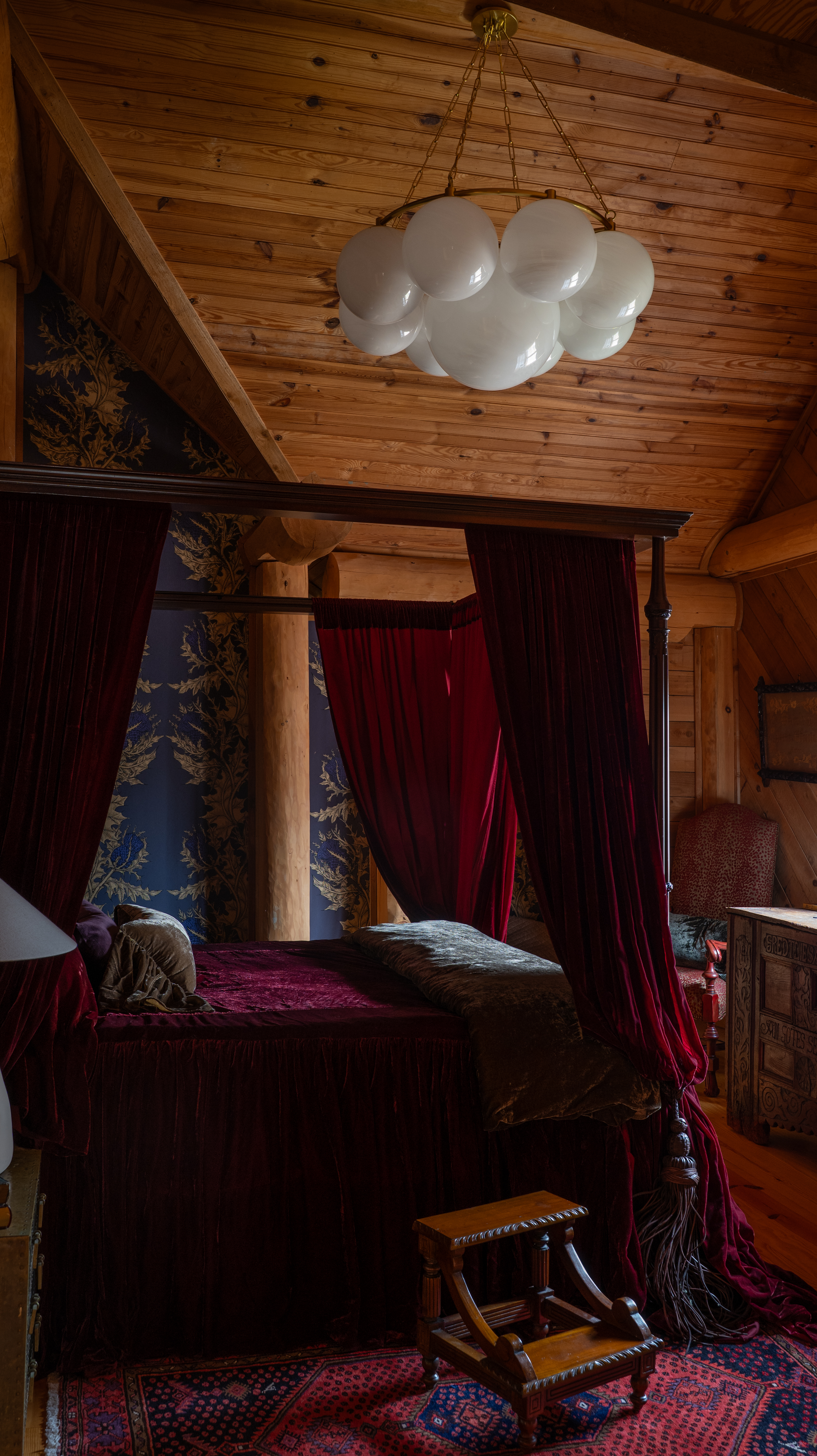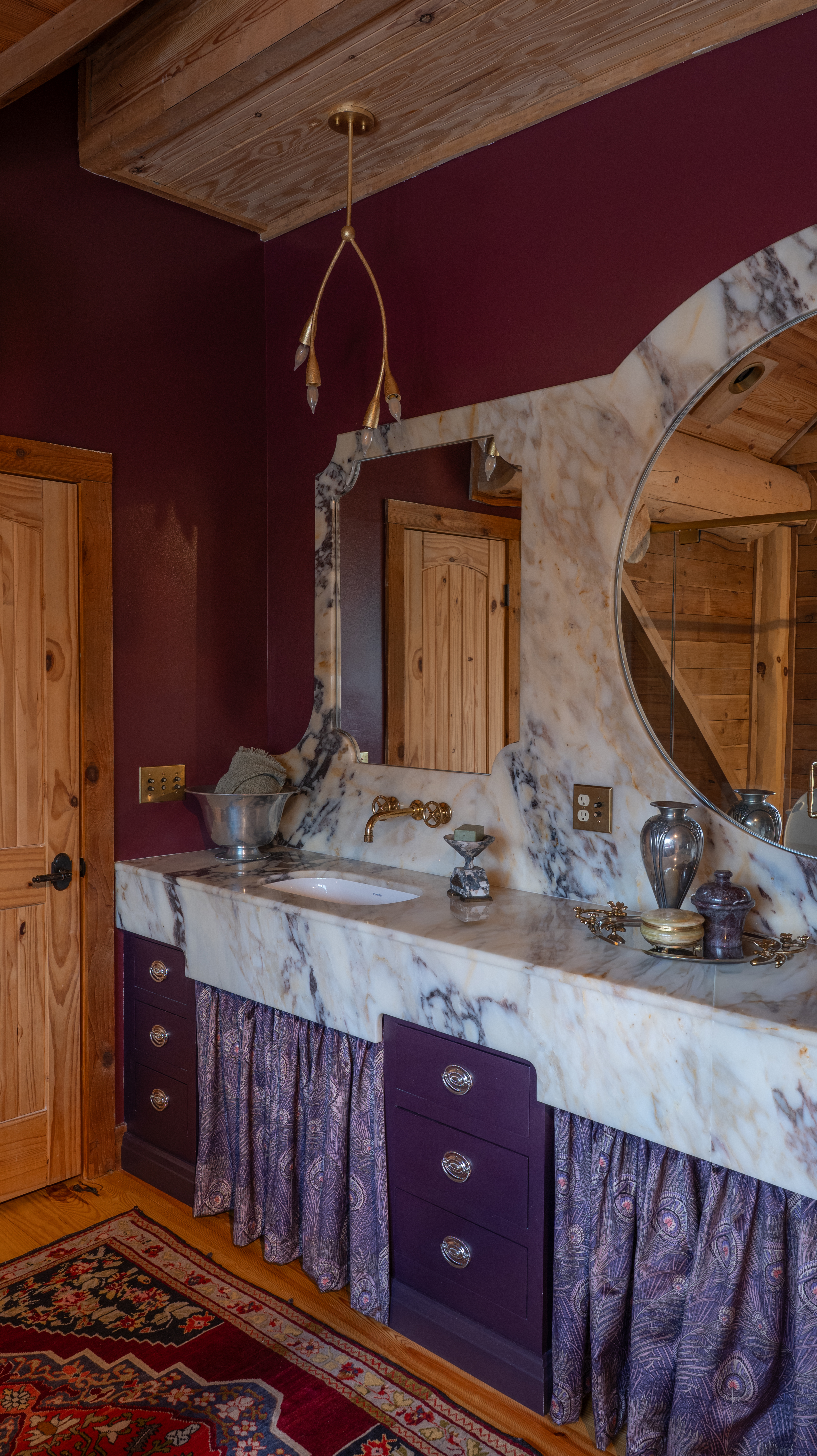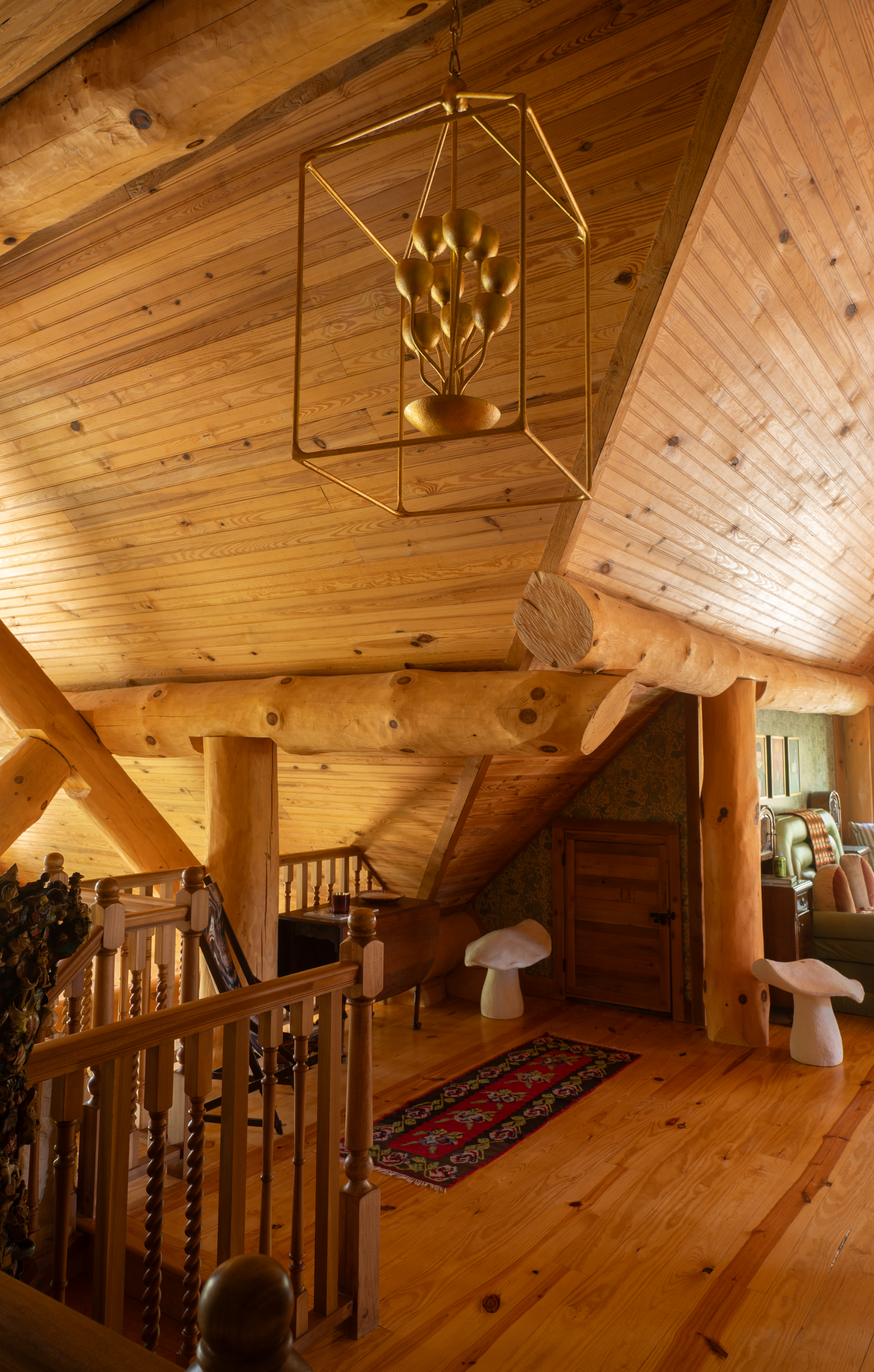 Jessie: I knew the traditional “rustic” log cabin decor was not the direction I wanted to go. The oversized logs in the cabin were so dramatic they almost led me to believe they must contain a little magic, and I found myself being drawn to the idea of log cabins as a setting for fairytales or storybooks. I wanted to go in a direction that could play with the other-worldliness of myth while incorporating natural elements. Art Nouveau fit that bill so perfectly, and I knew lighting would play a huge role in bringing that vision to life. The lighting needed to feel both historic and whimsical, as if they were enchanted. I adore pieces that ride the line between old and new, and Hudson Valley Lighting Group does that so masterfully.