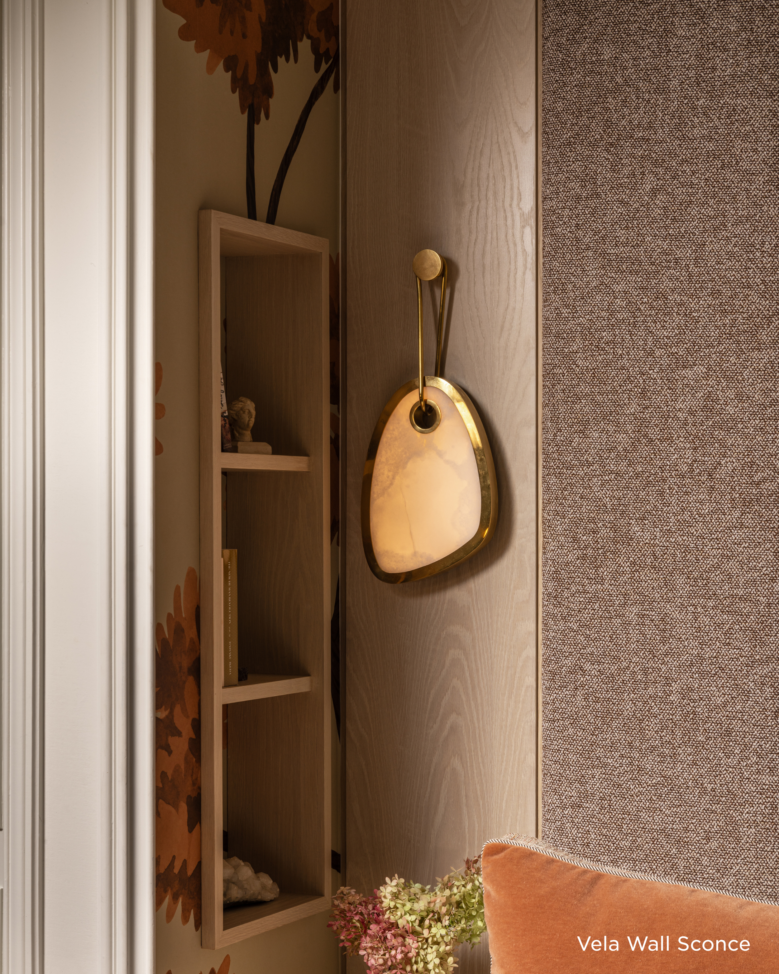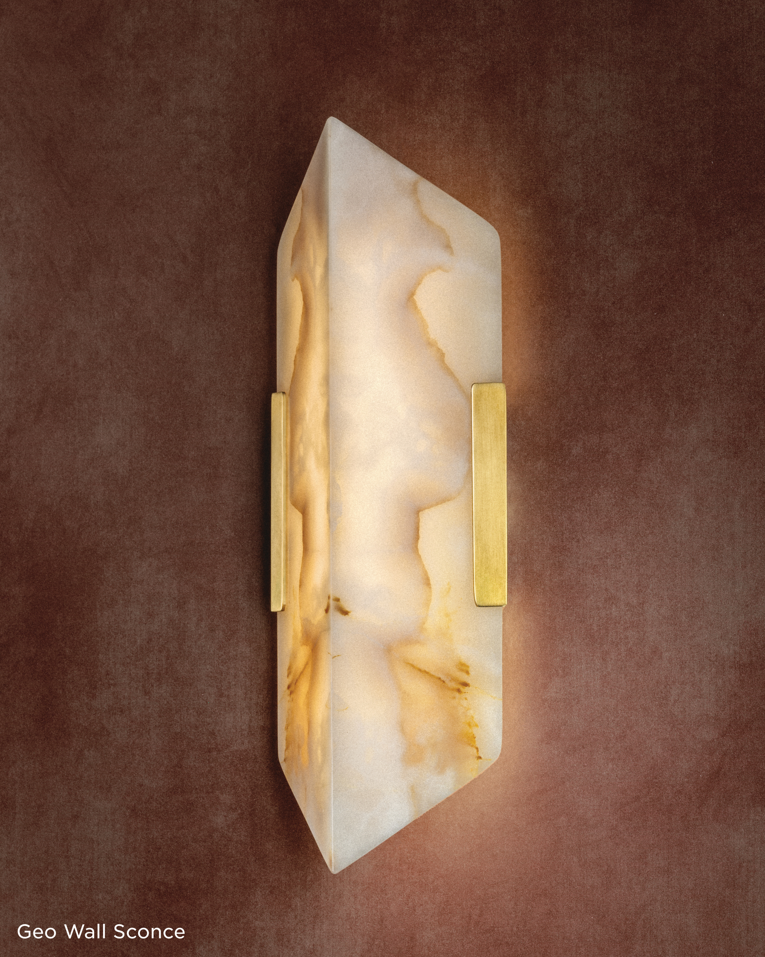 Geo is defined by its quiet strength and sculptural clarity. Glowing panels of honey onyx are book matched to reveal mirrored veining—an artisanal detail more often seen in luxury surfaces than lighting. The symmetry of the stone takes center stage, framed by clean, minimal metalwork in Vintage Brass that amplifies its natural elegance. Available as a 1-light wall sconce in two shapes and sizes, as well as a 1-light flush mount, Geo offers a soft, grounded glow that feels both bold and restrained. Its graphic silhouette and elemental beauty lend structure and visual rhythm to interiors.