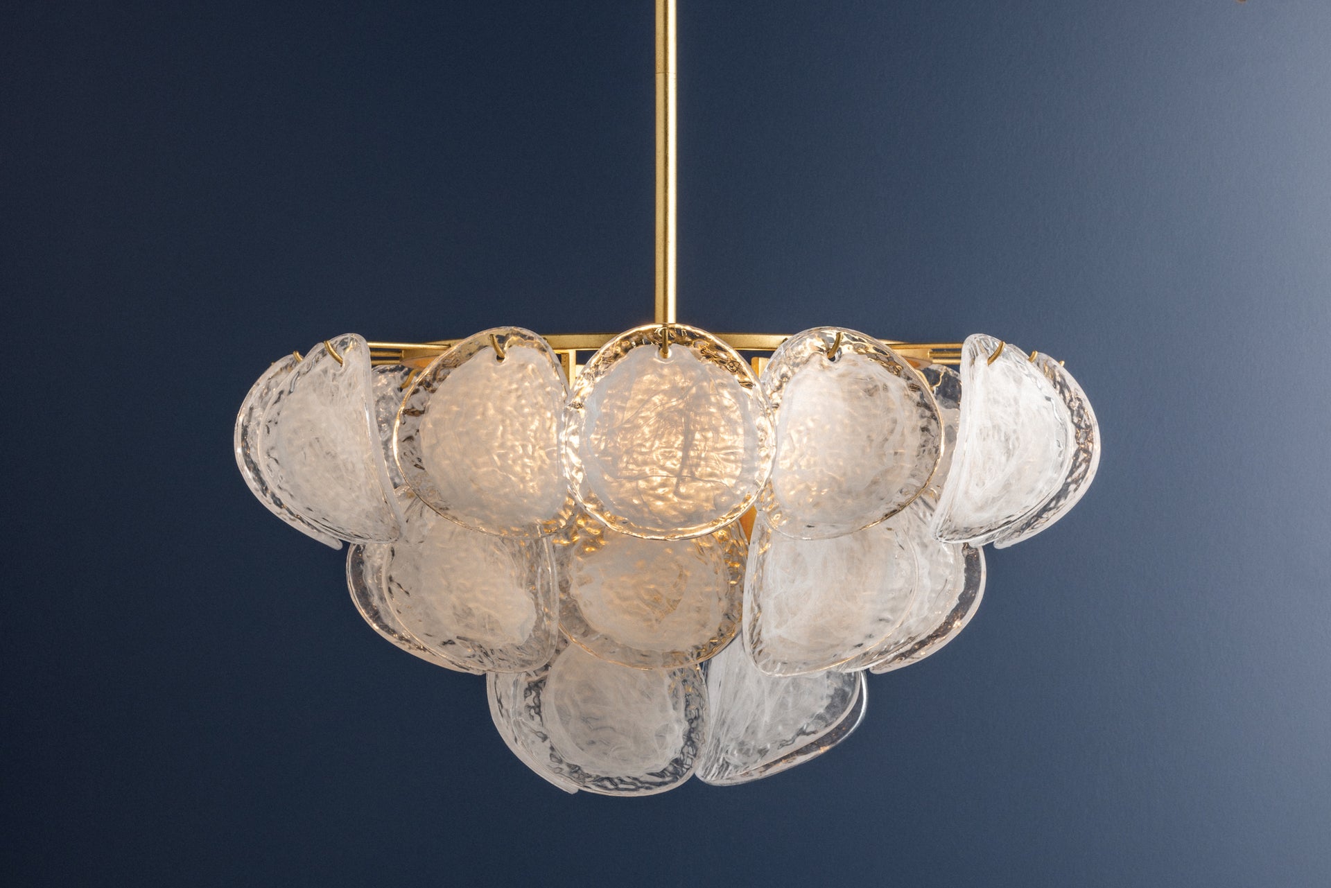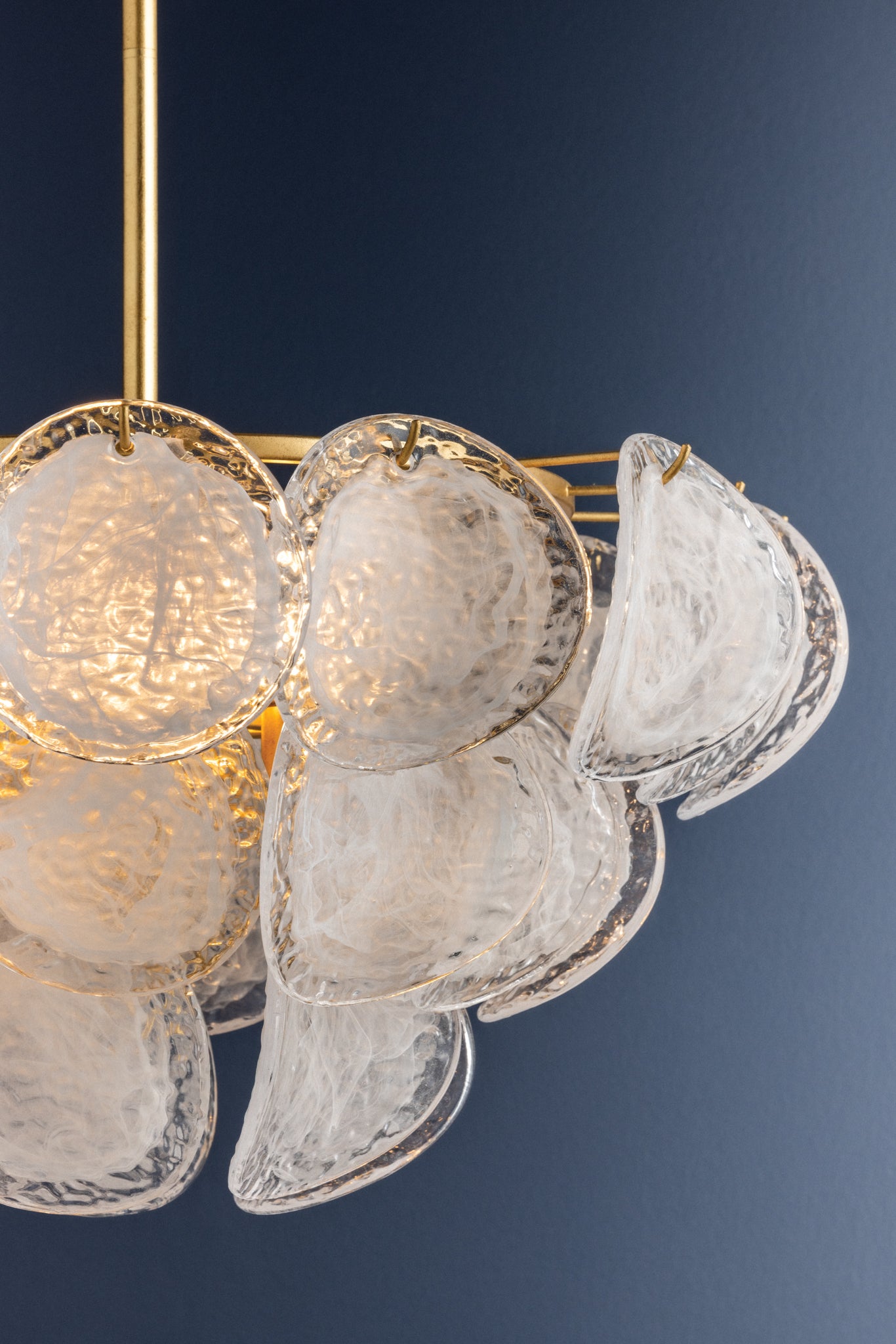 A celebration of maximalism, Cedar Hill is a whimsical tiered showpiece composed of painterly glass panels. Each suspended panel of Blonchino piastre glass curls slightly outwards, adding volume to the composition. Viewed from the side, Cedar Hill recalls a cluster of grapes on the vine; from below, it blooms like a rose. This lustrous fixture is available with 5, 9, or 17 lights with a Vintage Gold Leaf finish.