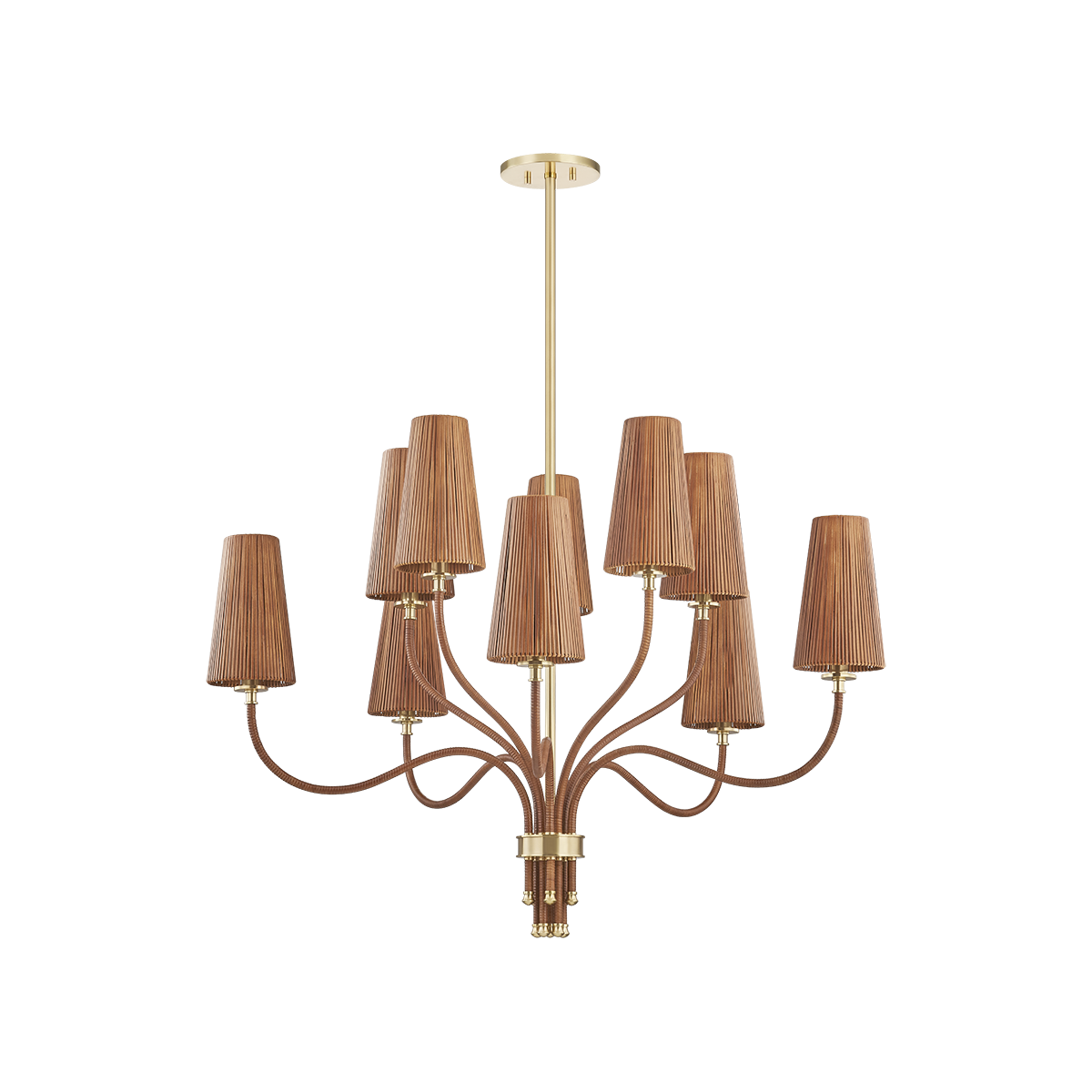 Paying homage to the sinuous creations of Finnish designer Paavo Tynell, the Atwood family uses natural materials to form striking branch-like silhouettes. Elongated arms and tapered shades are wrapped in rattan skin, creating an earthy, global statement. The metal rod, bobèches, and cuffs are finished in Aged Brass, lending a luxurious feel. Available as a 1-light sconce, 6-light chandelier, and 10-light chandelier, these pieces are designed to be layered throughout the home.