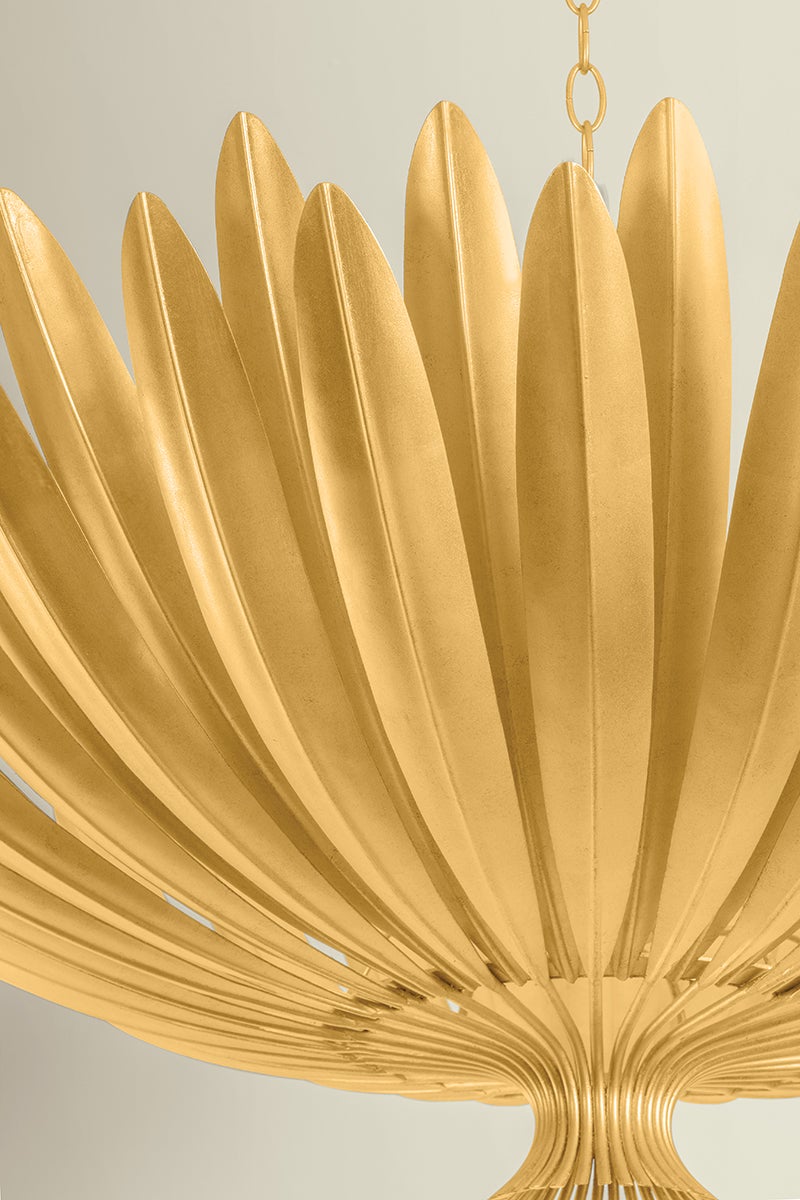 Leaning into a botanical motif, the Whitfield family is defined by elongated leaf-like metal pieces that form a glowing shade around the light source. As light emanates outwards, it filters through the layered foliage. Available as a 1-light wall sconce, a semi-flush mount with 3 lights, and three sizes of chandelier, Whitfield comes in a Vintage Gold Leaf finish or our new Cream Plaster finish, a soft alternative to white.