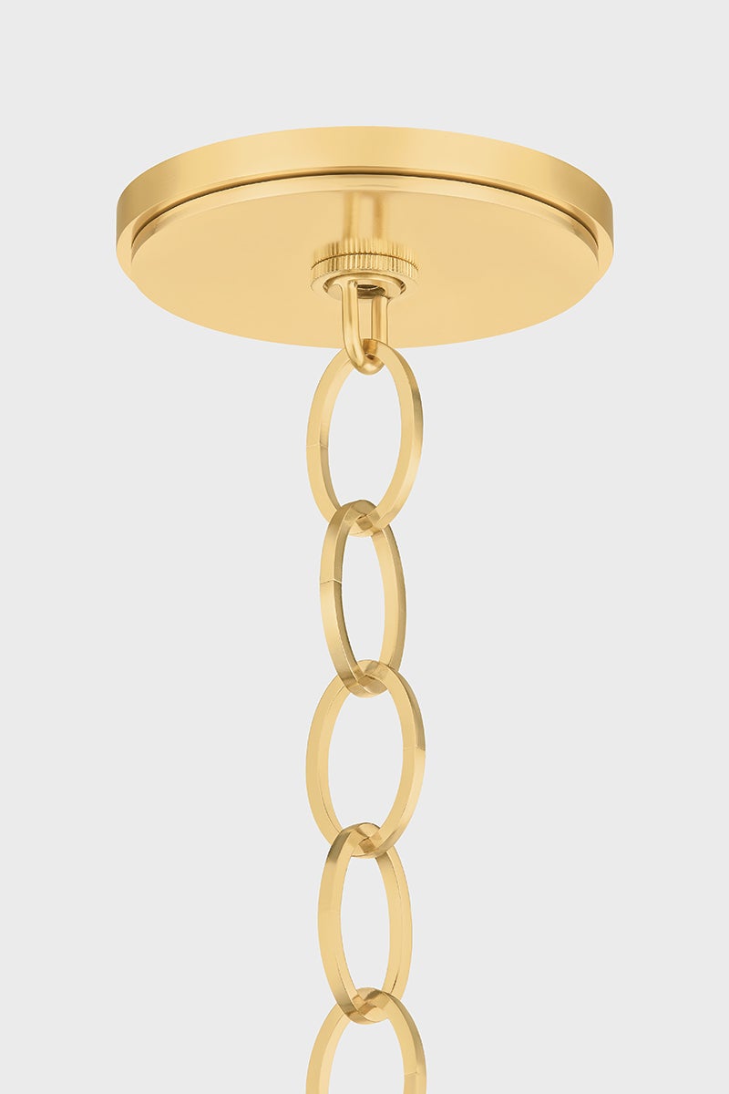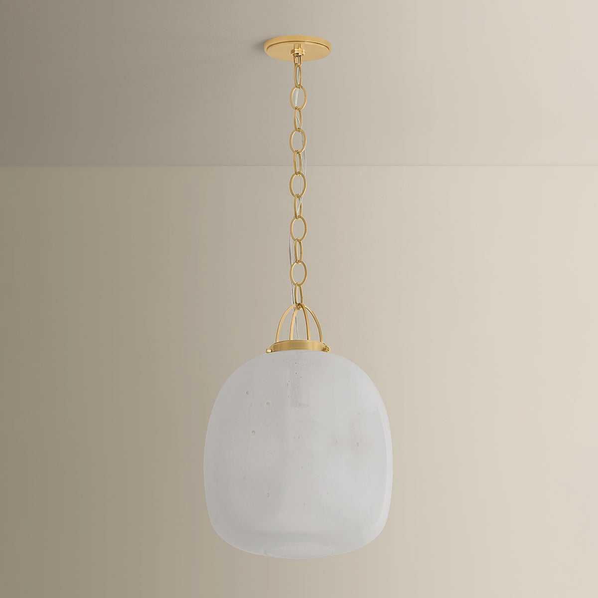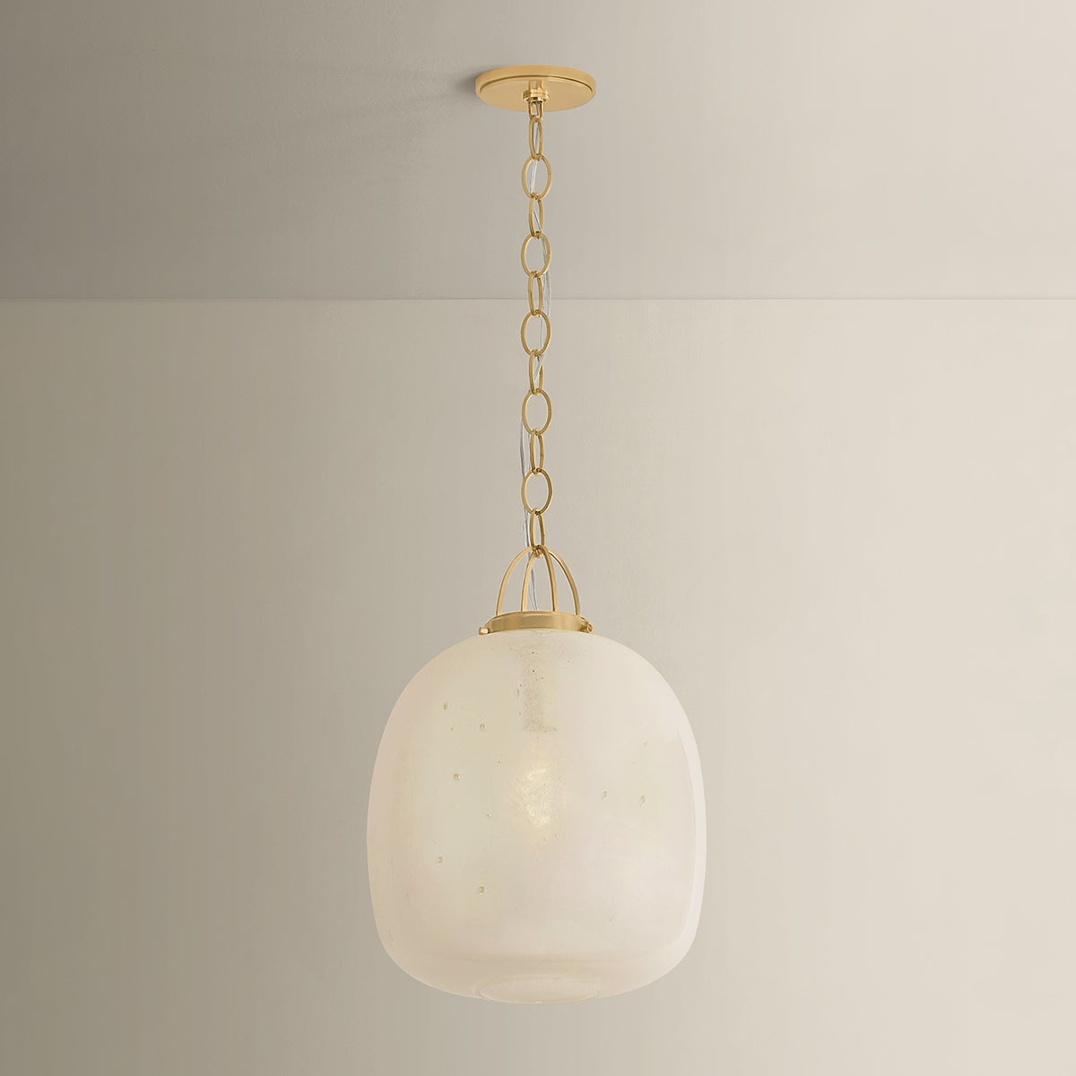 The Enosburg pendant pairs a soft organic shape with novelty metalwork. An oblong cloud seedy glass shade is supported by a cage-like suspension and chain finished in Aged Brass. The bubbling of the glass attracts the eye with its subtle, energetic texture. Available in two sizes, Enosburg makes a compelling statement over a dining table or when grouped above a kitchen island.