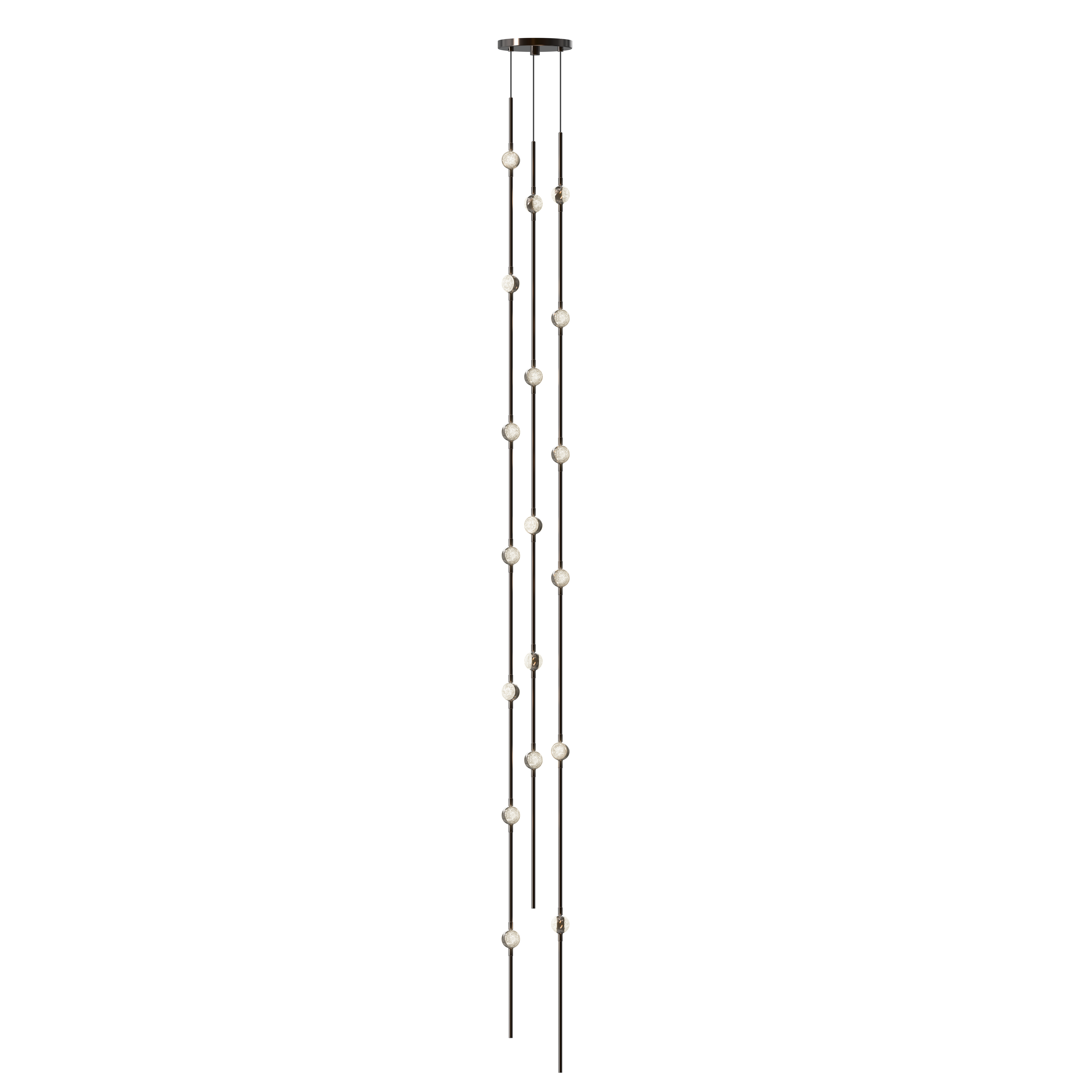 Celestial imagery meets modern technology in the Constellation® family. LED hubs are fastened along linear strands of various lengths like beads on a necklace. These are suspended in distinctive configurations, creating powerful luminance within a vertical space. Constellation® is available in nine distinct styles with limitless configurations. Choose from crystal facets or soft white lenses, with metal finishes of Satin Nickel, Espresso Black, or Satin Brass.
