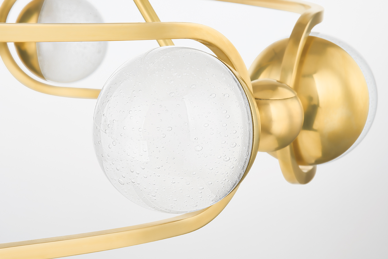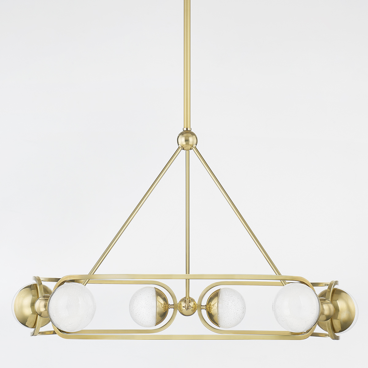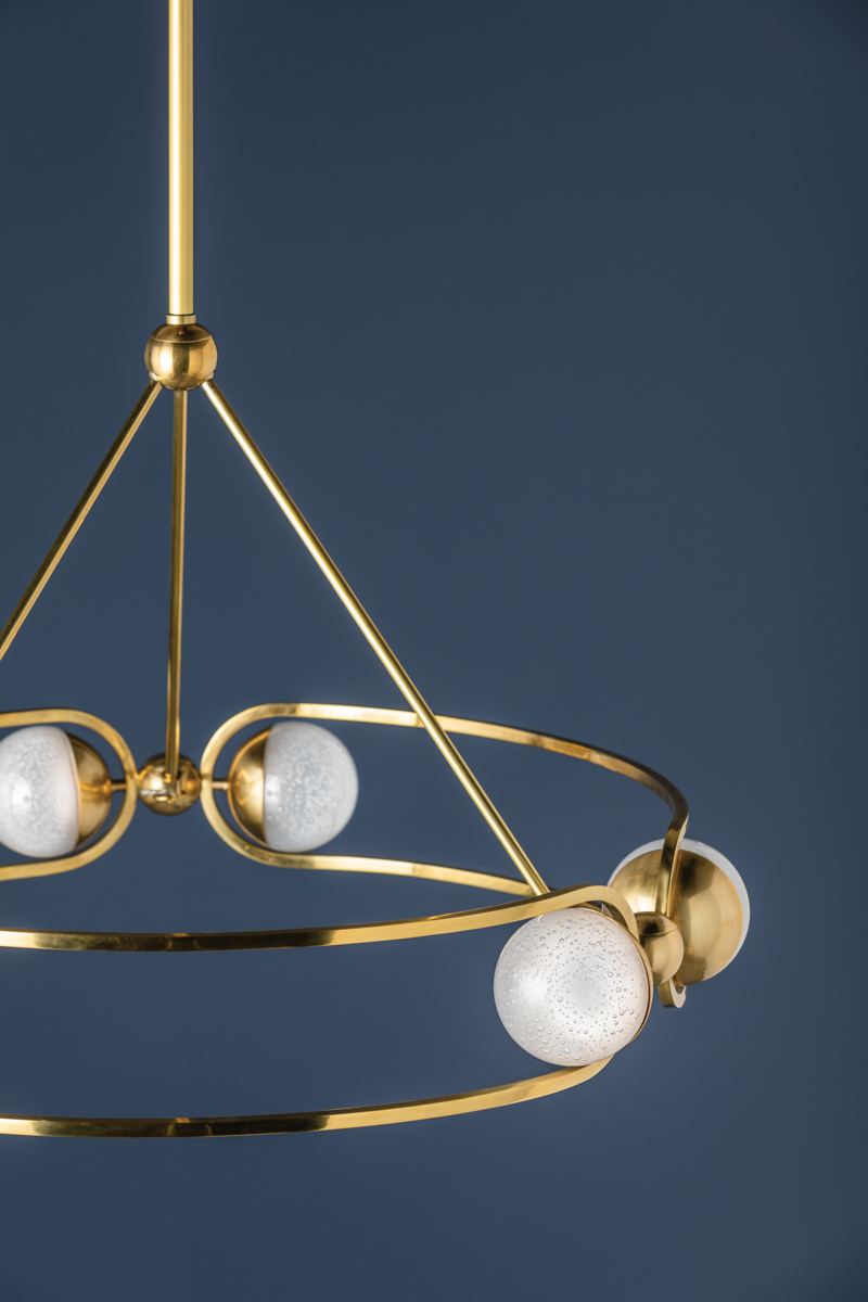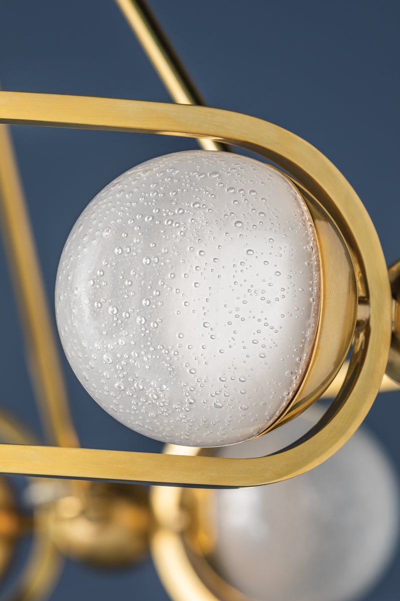 Hartford starts with the open, streamlined form of a round chandelier and updates it through on-trend material. A series of glass globes capped in Aged Brass and set at opposite ends of an open cylindrical frame form the airy, jewelry-inspired silhouette. The globes are made of a unique fizz glass, a dense bubble glass that is stunning when lit.