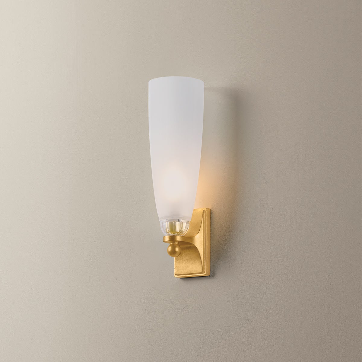 The Ravenswood sconce leans into pleasing symmetry. With one or two lights, this hallway-to-bath crossover features translucent clear etched glass that lets the light filter through with an inviting glow. The shades are supported by Vintage Gold Leaf-finished caps with rounded edges, adding a decorative, upscale flourish.