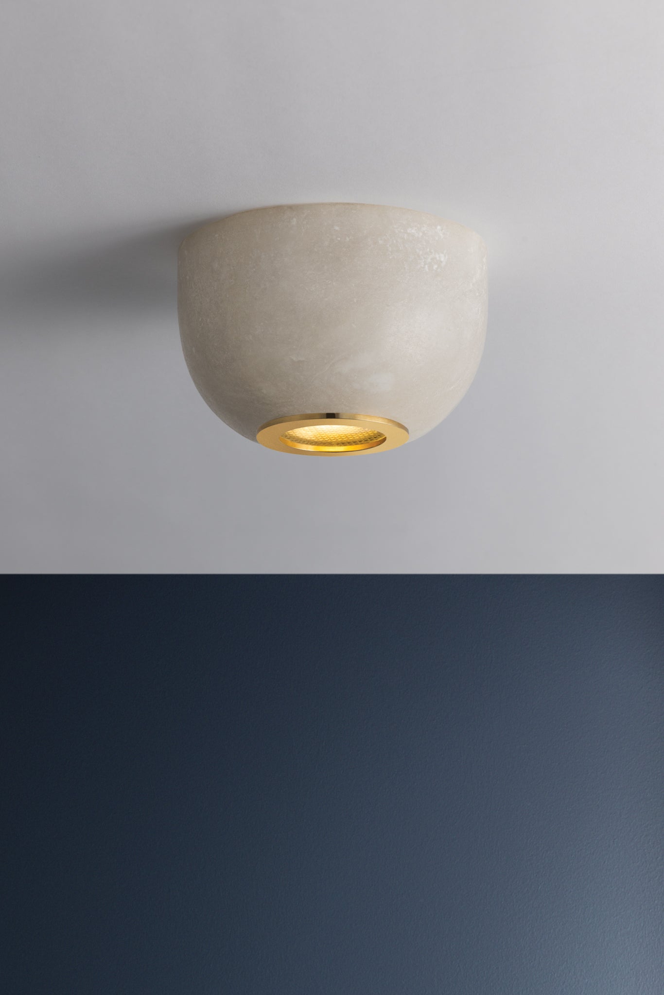 The Bains Corner flush mount uses specialty stone to create the perfect petite overhead light. The natural veining of the alabaster hemisphere is defined by subtle color variations that make every piece one-of-a-kind. A slender metal ring finished in Aged Brass trims the fixture, adding a luxurious contrast of materials. The convex dish shape of Bains Corner is designed to cover a standard junction box, making installation a breeze.