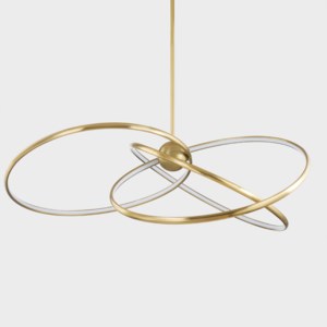 Jewelry-inspired and celestial, this modern, airy design features three LED rings, with a Vintage Brass exterior and a Matte White Acrylic interior, orbiting a large center sphere. Alula's dramatic, dynamic silhouette adds both energy and a quiet peacefulness to a space.