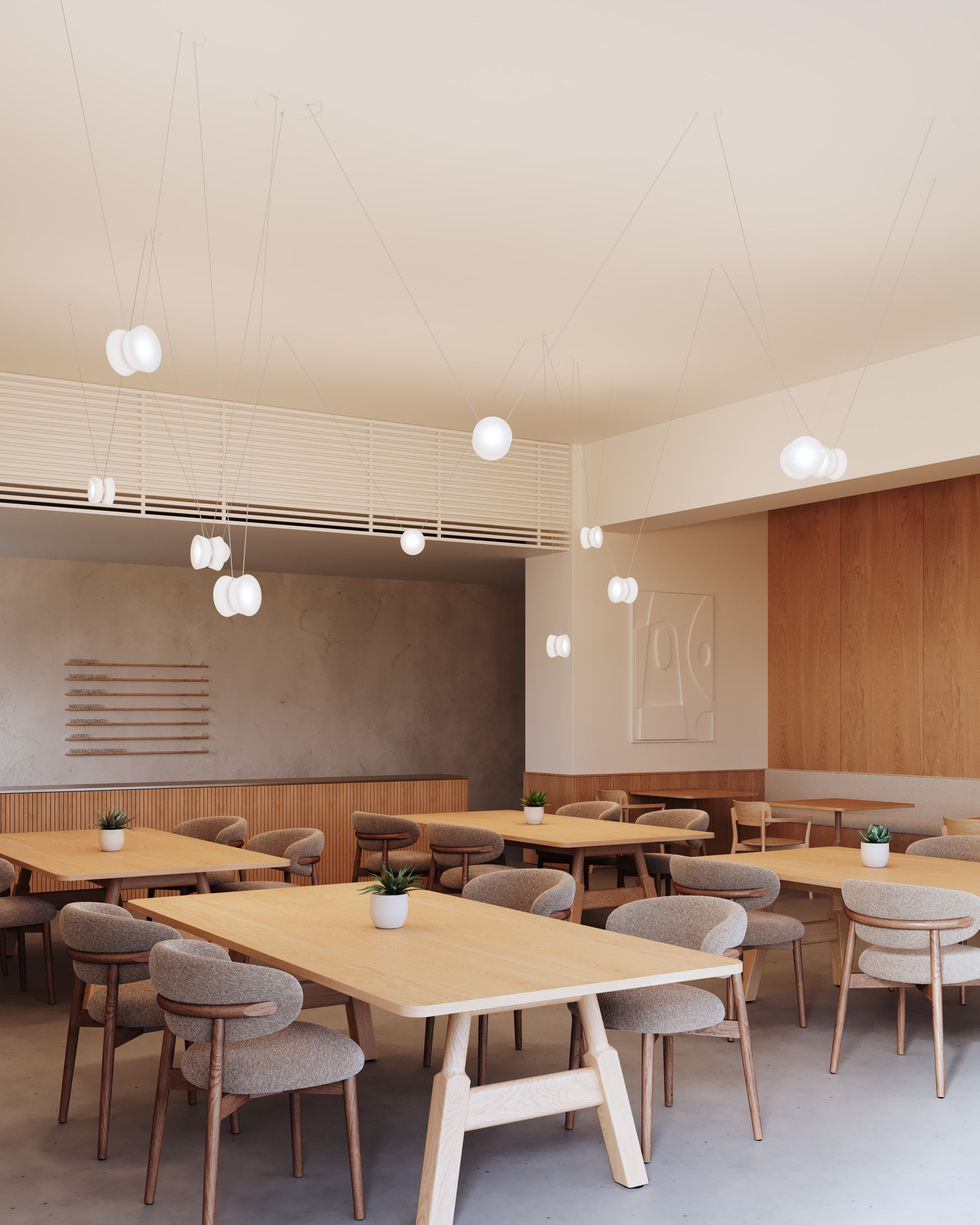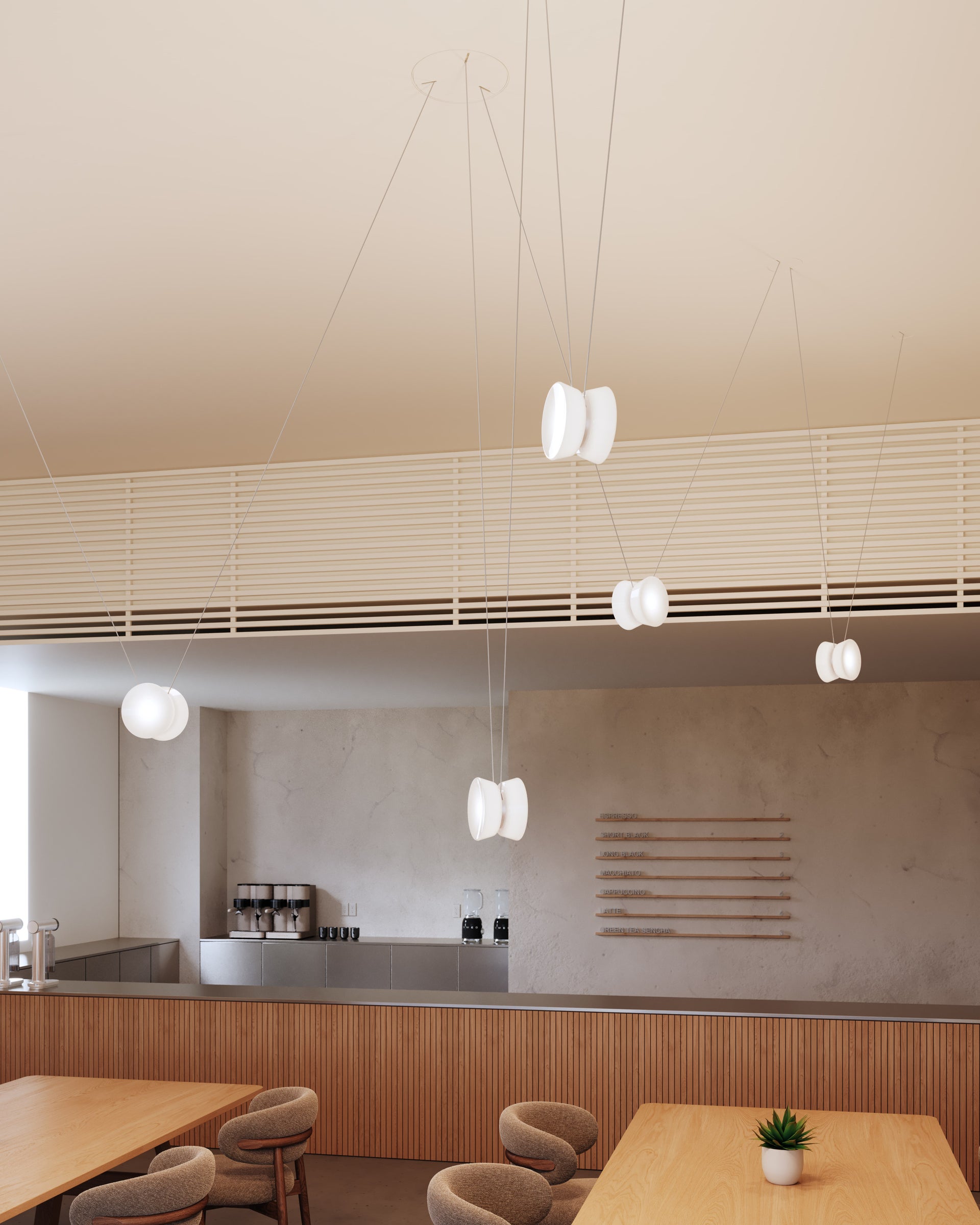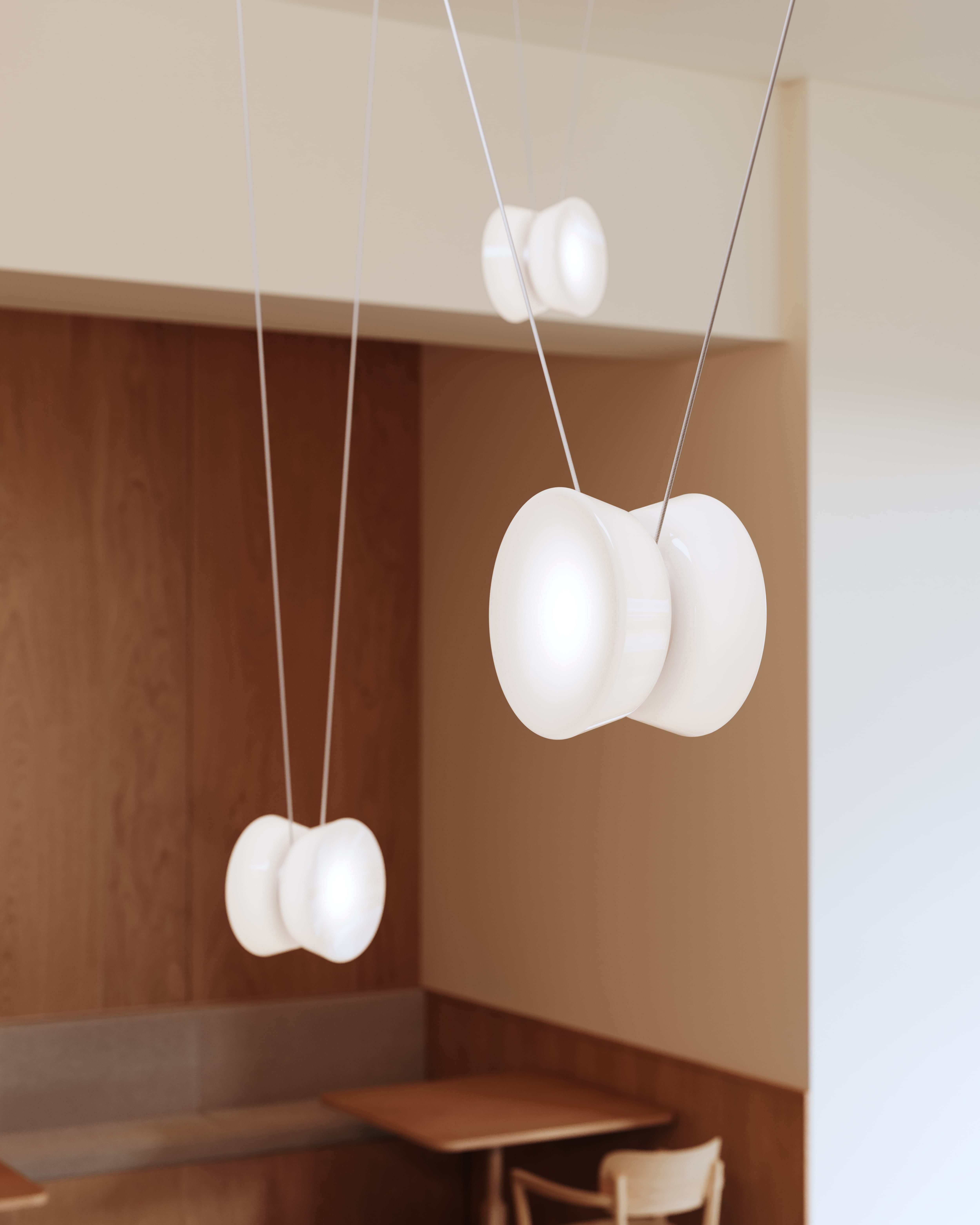 Inspired by the elegant geometry of a yo-yo, the Yo family of chandeliers transforms playful forms into sophisticated lighting solutions. Adjustable by design, each shade glides effortlessly along its cord, adapting to spaces with ease. This allows for more focused illumination when lowered and ambient radiance when raised. The configurations come in a variety of sizes with three shade shapes and a Natural Anodized finish on the metalwork.