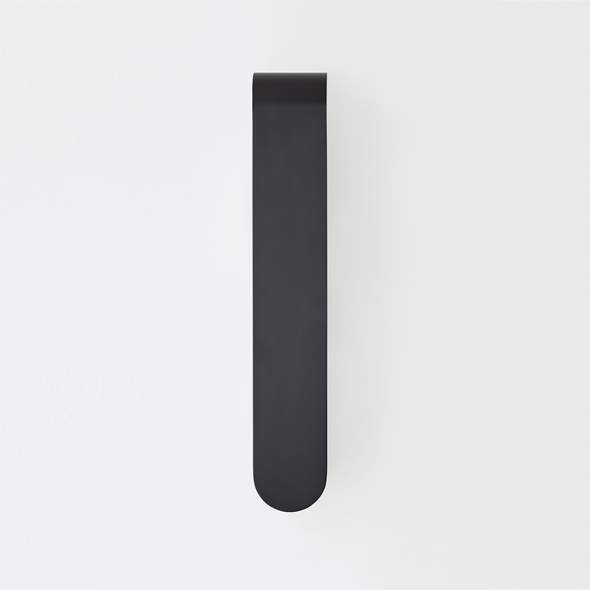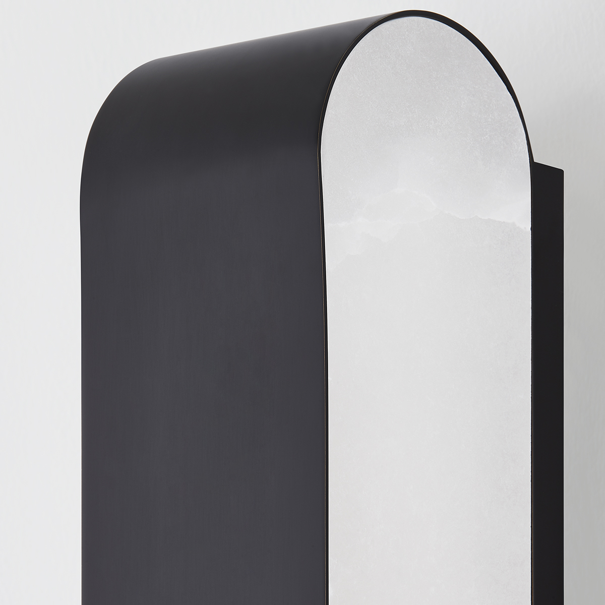 The lines of a curved piece of Aged Brass or Black Brass flow effortlessly into the smooth lines of an alabaster shade creating a sleek, modern form that draws the eye. Light fills the alabaster and emits a soft glow from the sides of the fixture. This versatile sconce is available in both a slender and stout shape and can be mounted for uplight or downlight.