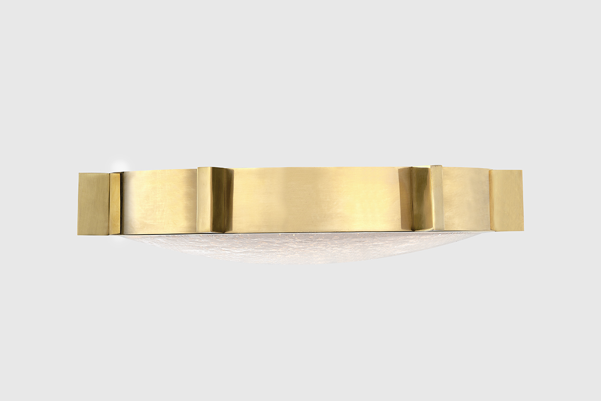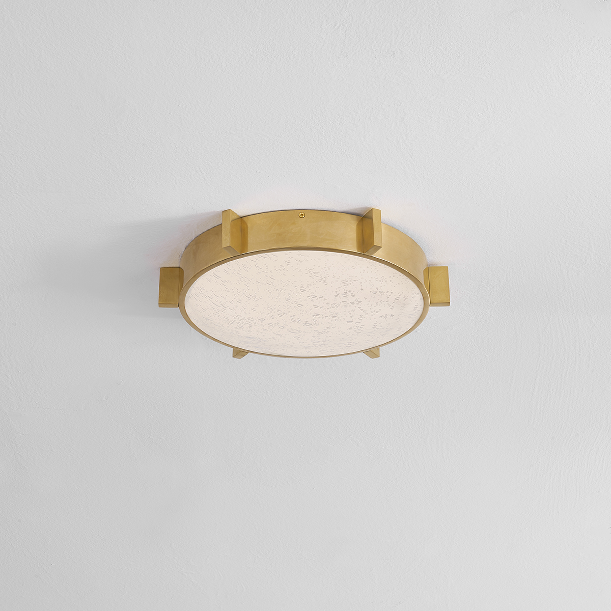 Exploring the beauty of mixed materiality, seeded Sprite Glass discs are displayed like precious gems within a polished Vintage Brass setting. While the bubbled texture of the glass embodies an underwater quality, the brass encasing serves as a steadfast anchor. Steeped in sophistication, Ansonia is available as a sconce in two sizes or a ceiling flush mount.