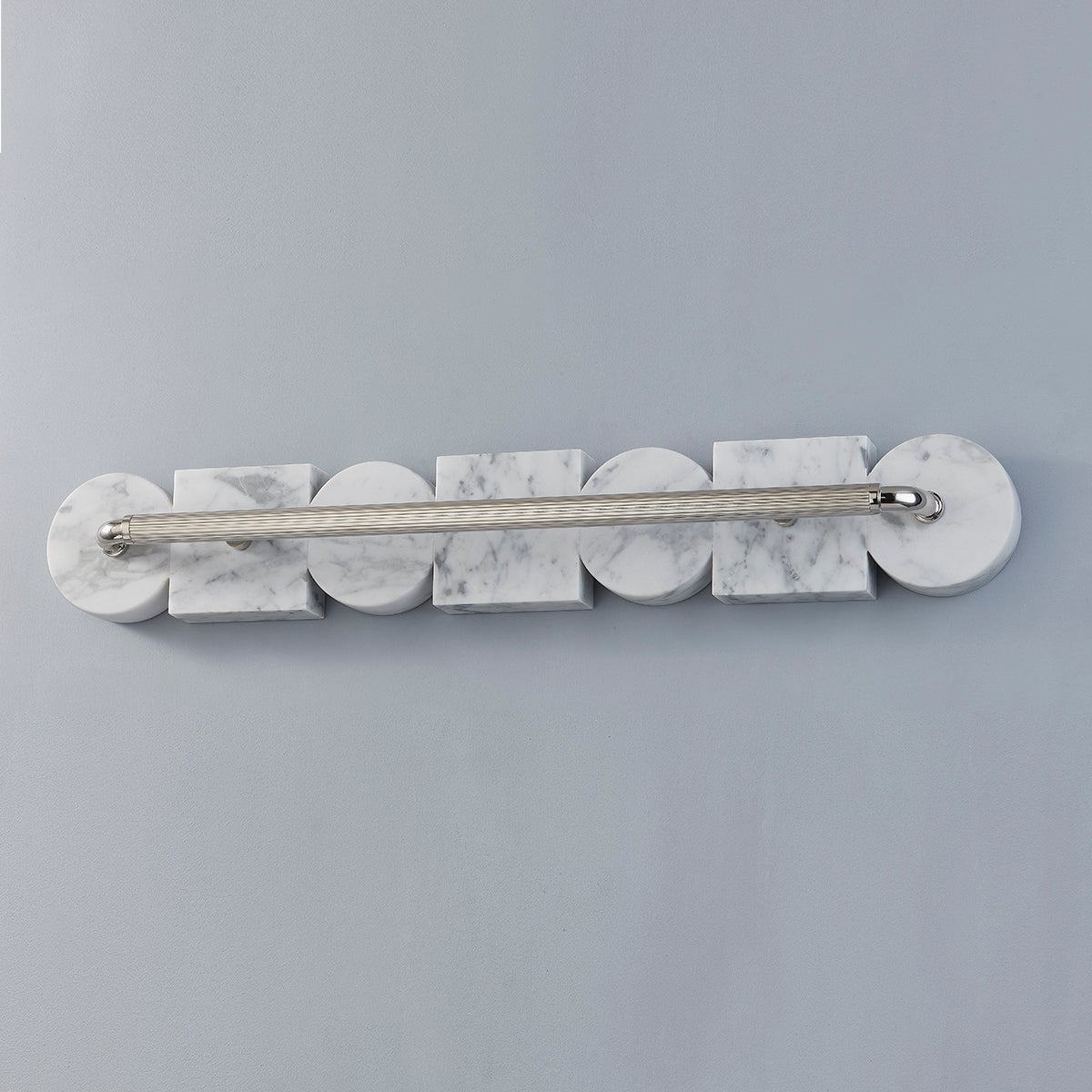 A stacked, repeated series of circles and squares are at the center of this geometric showstopper. Mixing materials and textures, the marble shapes in Nero Madero or Arabescato are lit by a ribbed metal bar in Vintage Brass or Burnished Nickel. Sena offers many stylish possibilities—as the sconce can be mounted vertically or horizontally.