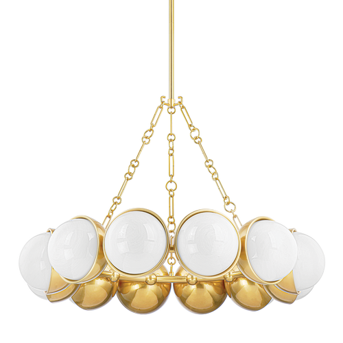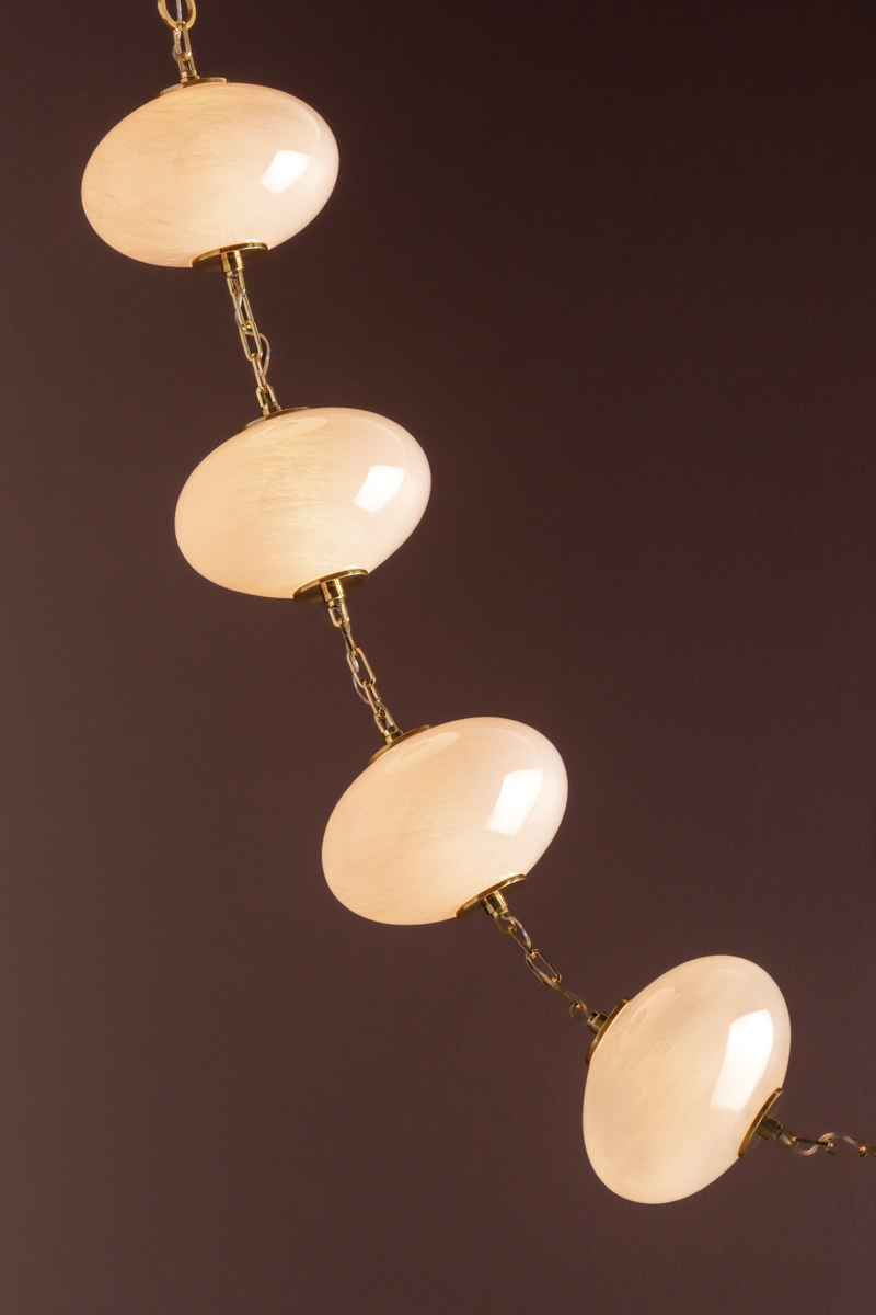 Echoing the artistry of bespoke installations and the graceful allure of fine jewelry, Nephele floats elegantly in space, resembling a string of luminous pearls suspended in perfect harmony. Each softly glowing cloud glass orb is held in place by intricately detailed Vintage Polished Brass links, creating a striking interplay of light and form.