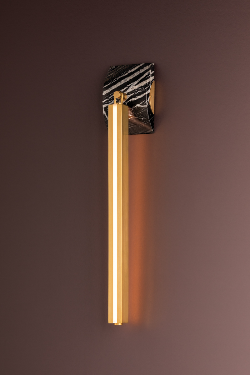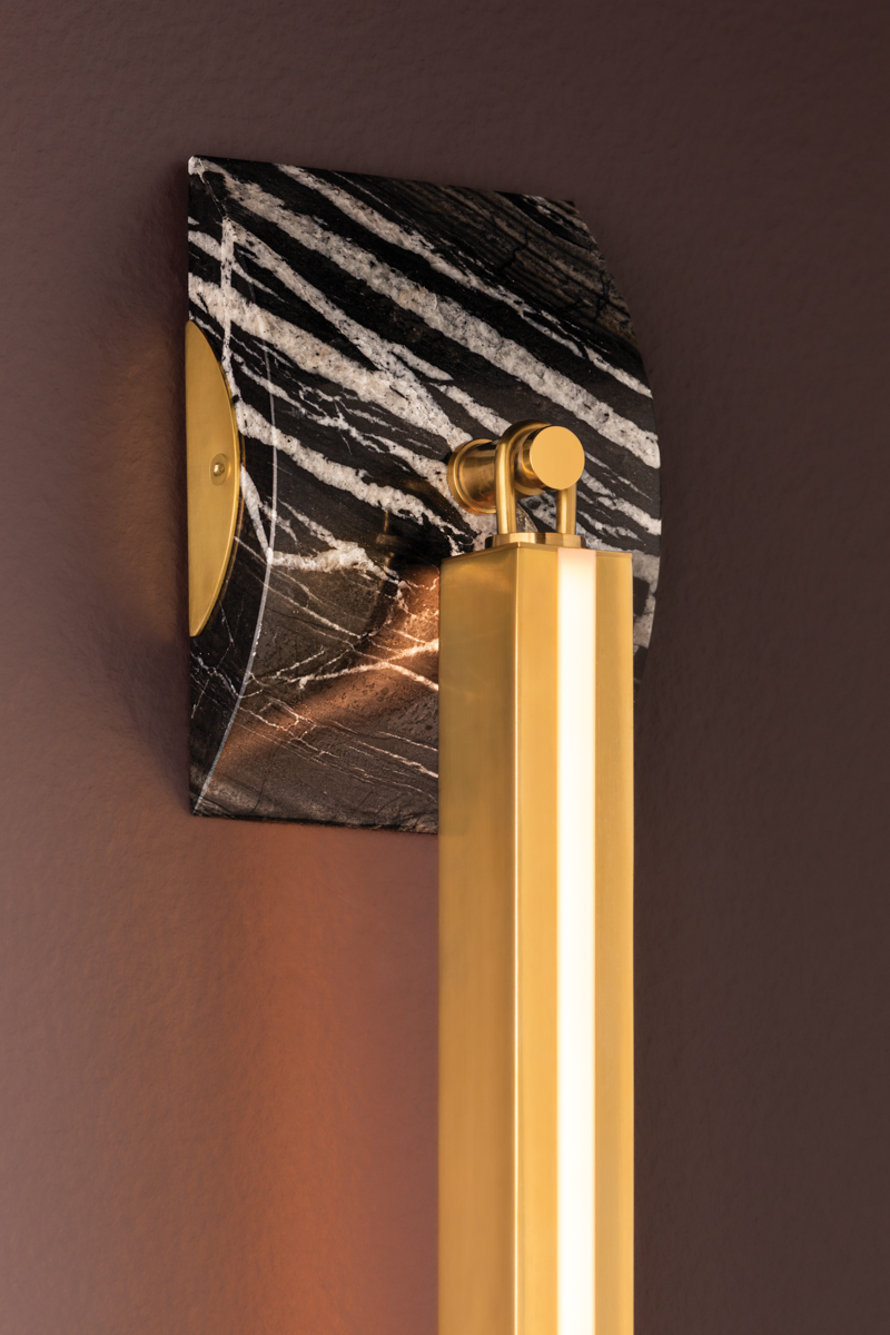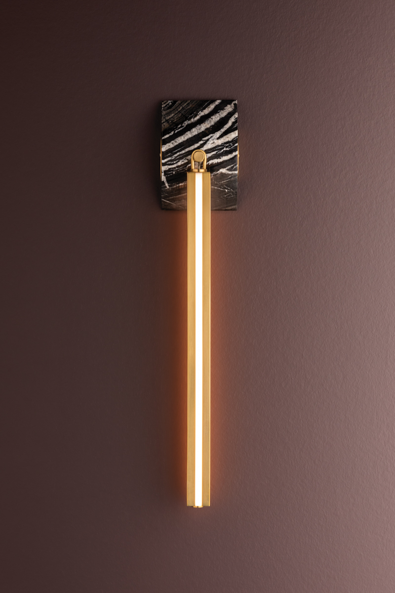 Silja exudes modern elegance by melding architectural and jewelry design languages together. The rectangular profile of the Vintage Brass metalwork emits light from both the front and back, illuminating all sides with a warm glow. The Nero Madera marble backplate lends a luxe material quality to this fixture, adding value to a piece that is perfectly suited to a bath area.
