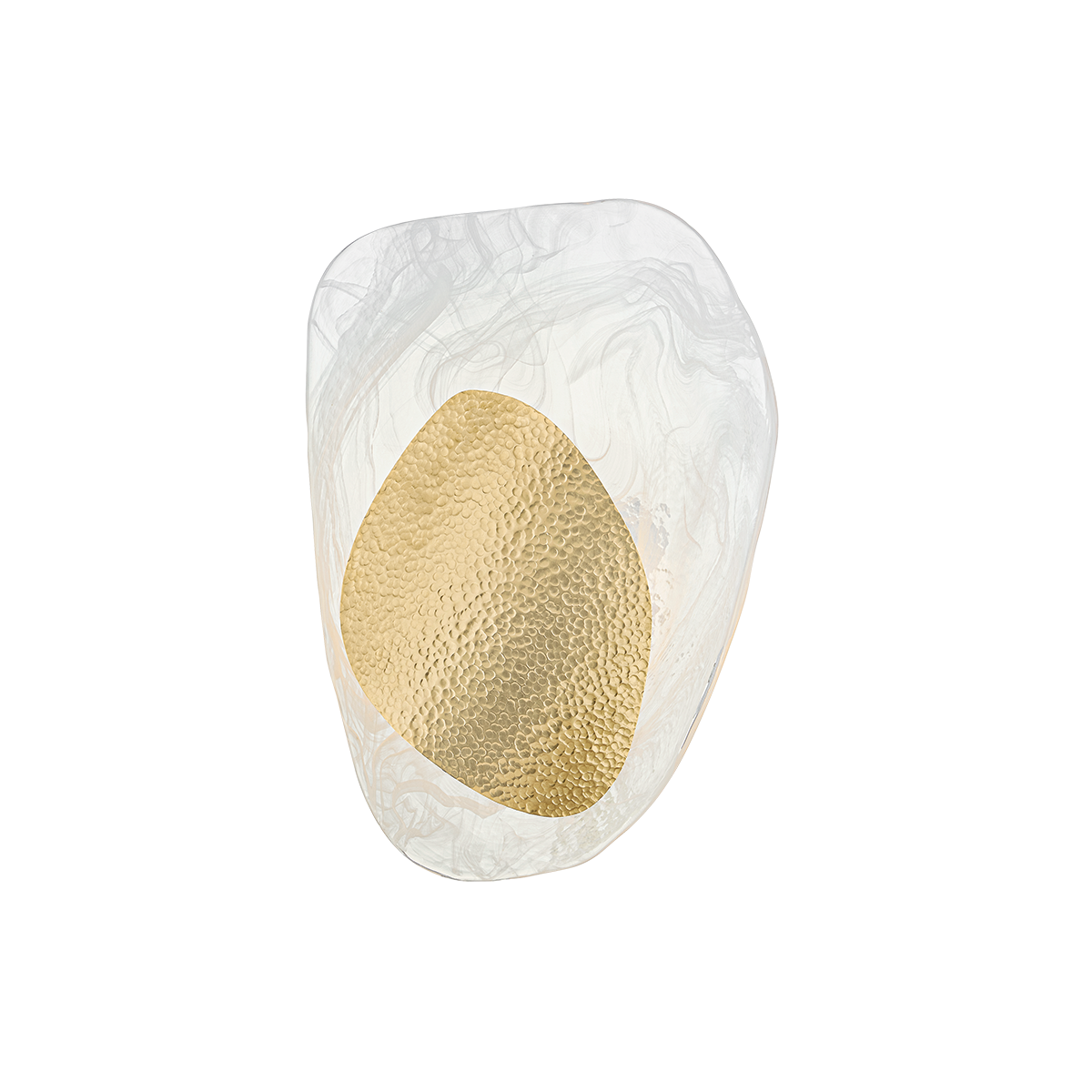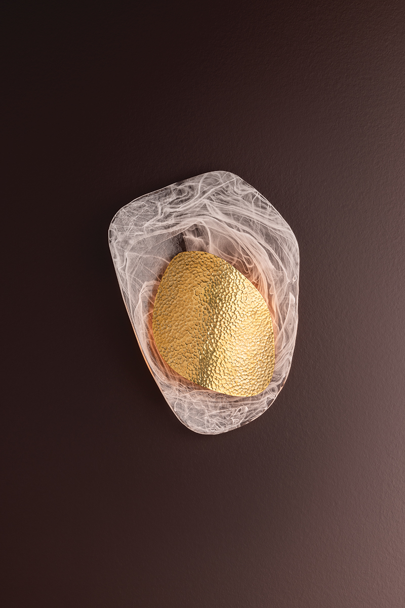 Dynamic design lines and layered materials combine in the eye-catching composition of Bilbao. This artful sconce pairs delicate cast Piastra glass with a hammered Vintage Brass abstract form, creating a luxurious contrast. As it gently curves away from the wall, Bilbao breathes life into a space with its vaguely botanical beauty.