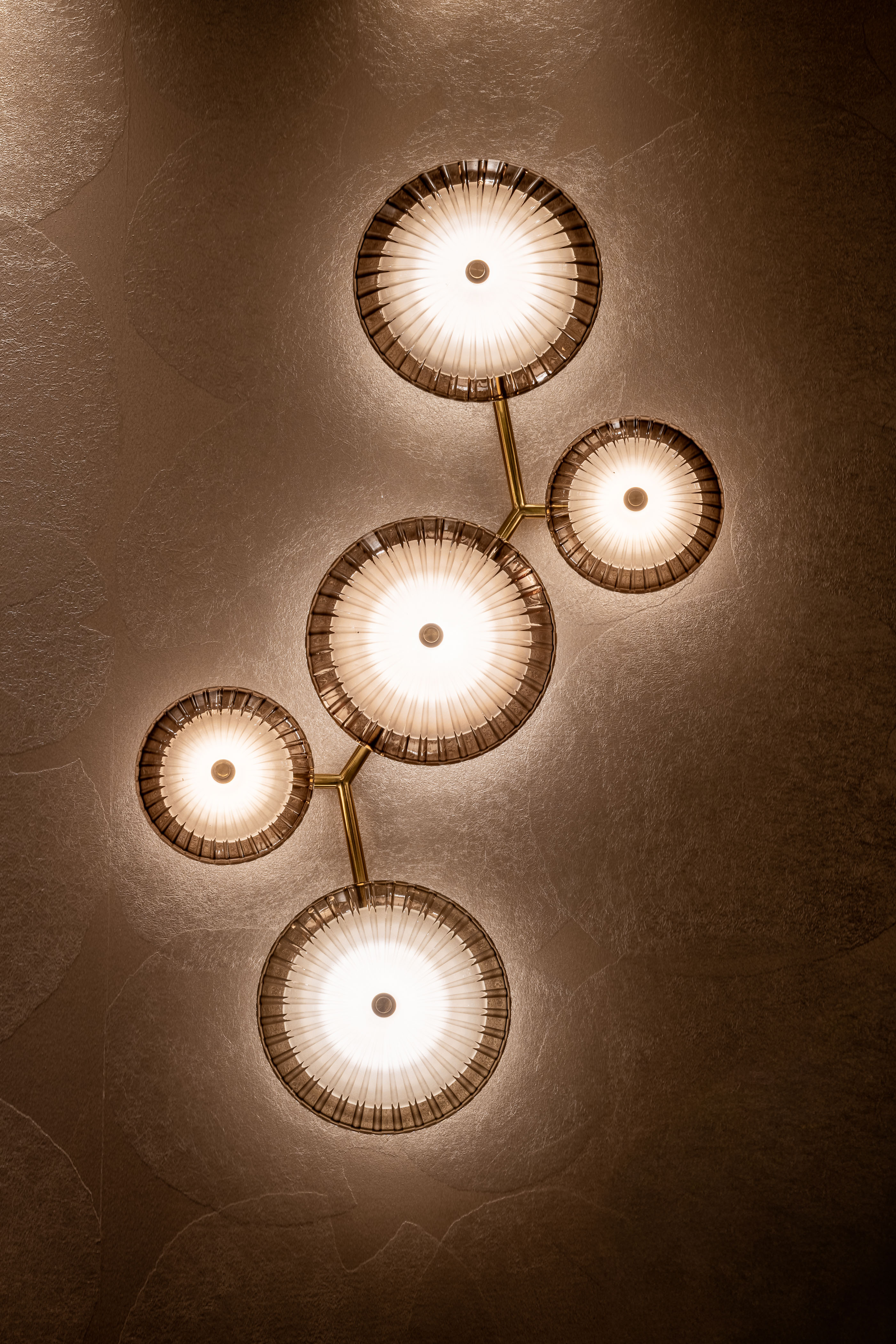 Drawing inspiration from natural branching forms, Birmingham makes a boldly modern wall art statement. The design features starburst cast topaz Piastre glass shades and clear etched glass shades, facilitating an interplay of light, texture, and shape. Its unique scale and silhouette create a sculptural, immersive experience that draws the eye. Birmingham is available in three formats with a Vintage Brass finish.