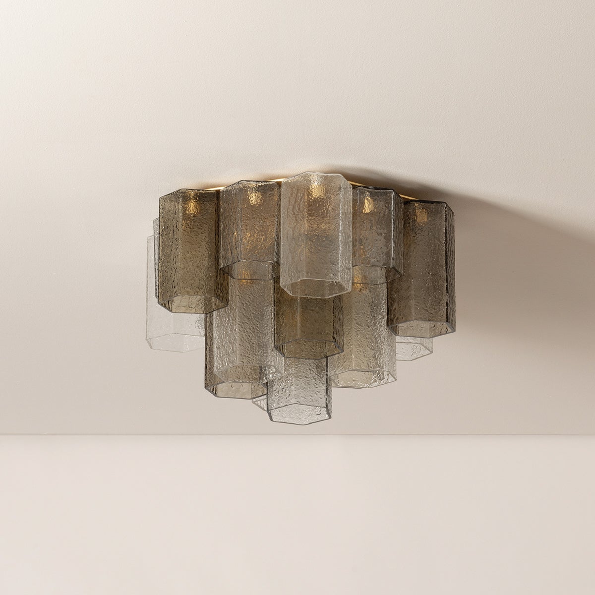 The complex layered design, exquisite use of specialty glass, and scale of Helsinki make a glamorous first impression. Featuring clear, light bronze, and smoke glass, this statement ceiling fixture creates a captivating visual effect with its hexagonal glass shades, staggered in both color and length to form a dense, honeycomb-like shape. Available in two sizes, Helsinki brings a sense of drama to a larger space.
