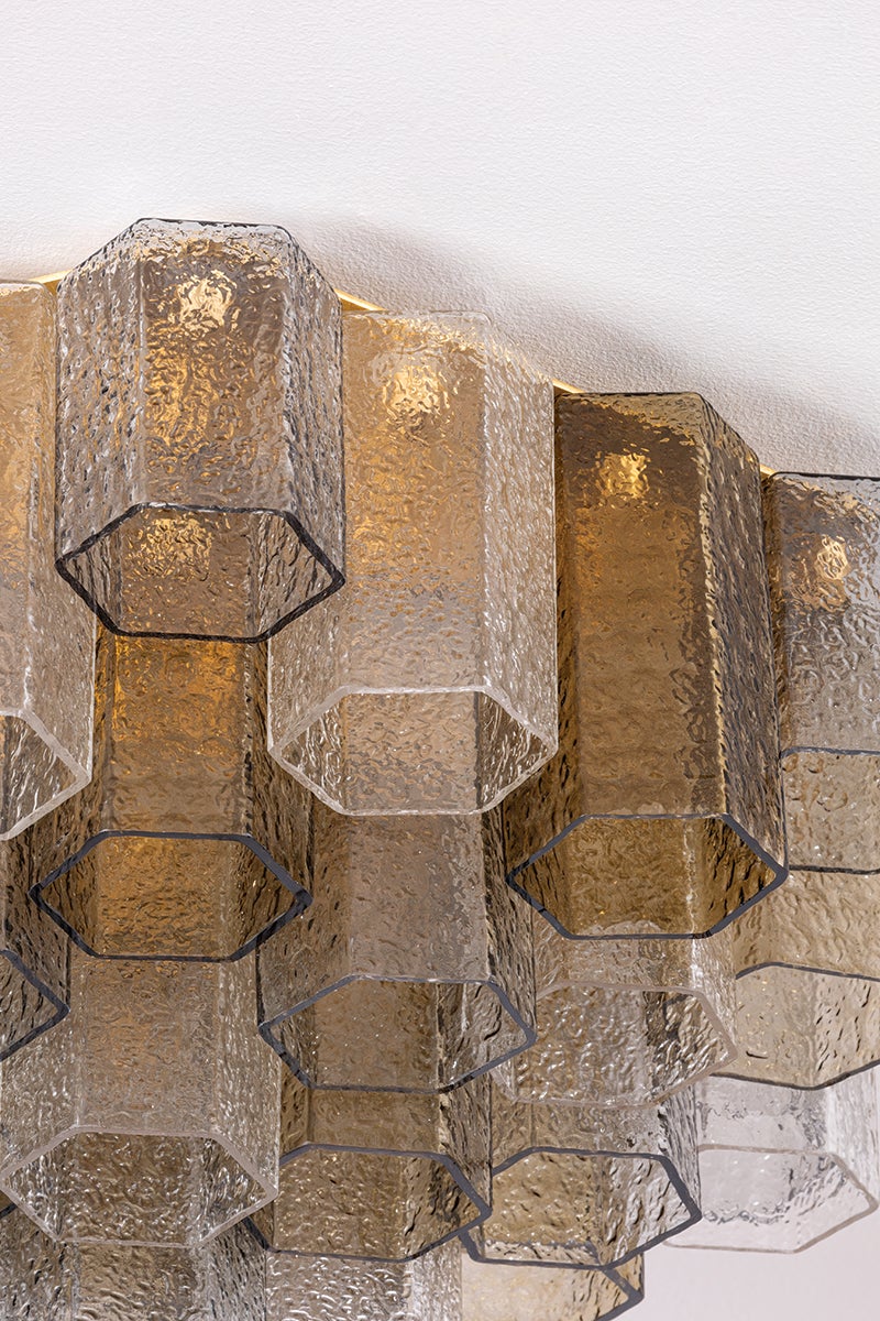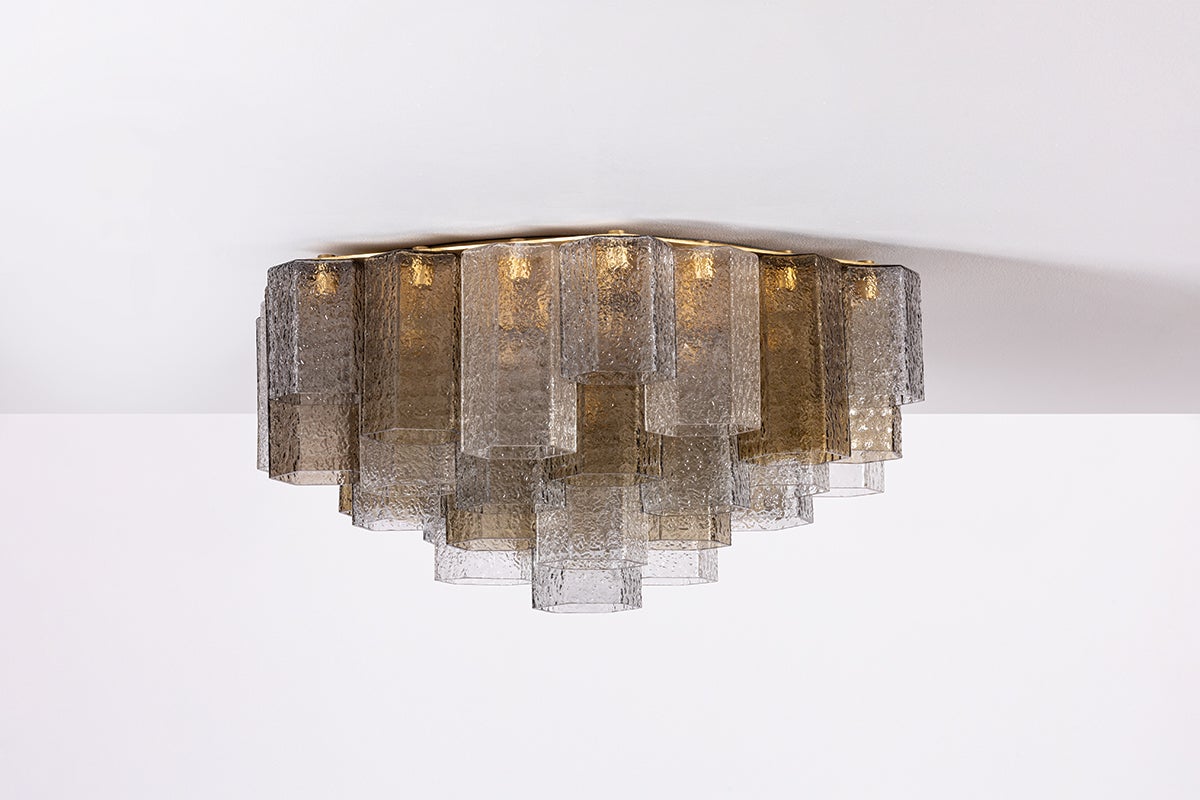 The complex layered design, exquisite use of specialty glass, and scale of Helsinki make a glamorous first impression. Featuring clear, light bronze, and smoke glass, this statement ceiling fixture creates a captivating visual effect with its hexagonal glass shades, staggered in both color and length to form a dense, honeycomb-like shape. Available in two sizes, Helsinki brings a sense of drama to a larger space.