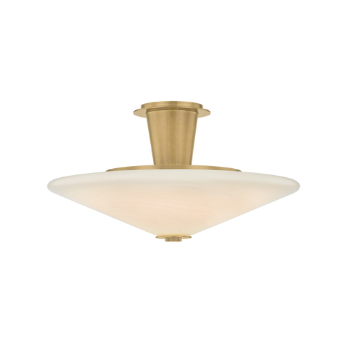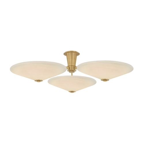 Modern and sophisticated, the Cologne semi-flush mount features sleek metalwork and wide tapered cloud glass shades. Finished in Vintage Brass, the frame complements and supports the disc-like shape of the shades without detracting from them. Available with 1, 3, or 5 lights, Cologne makes an architectural statement on the ceiling.