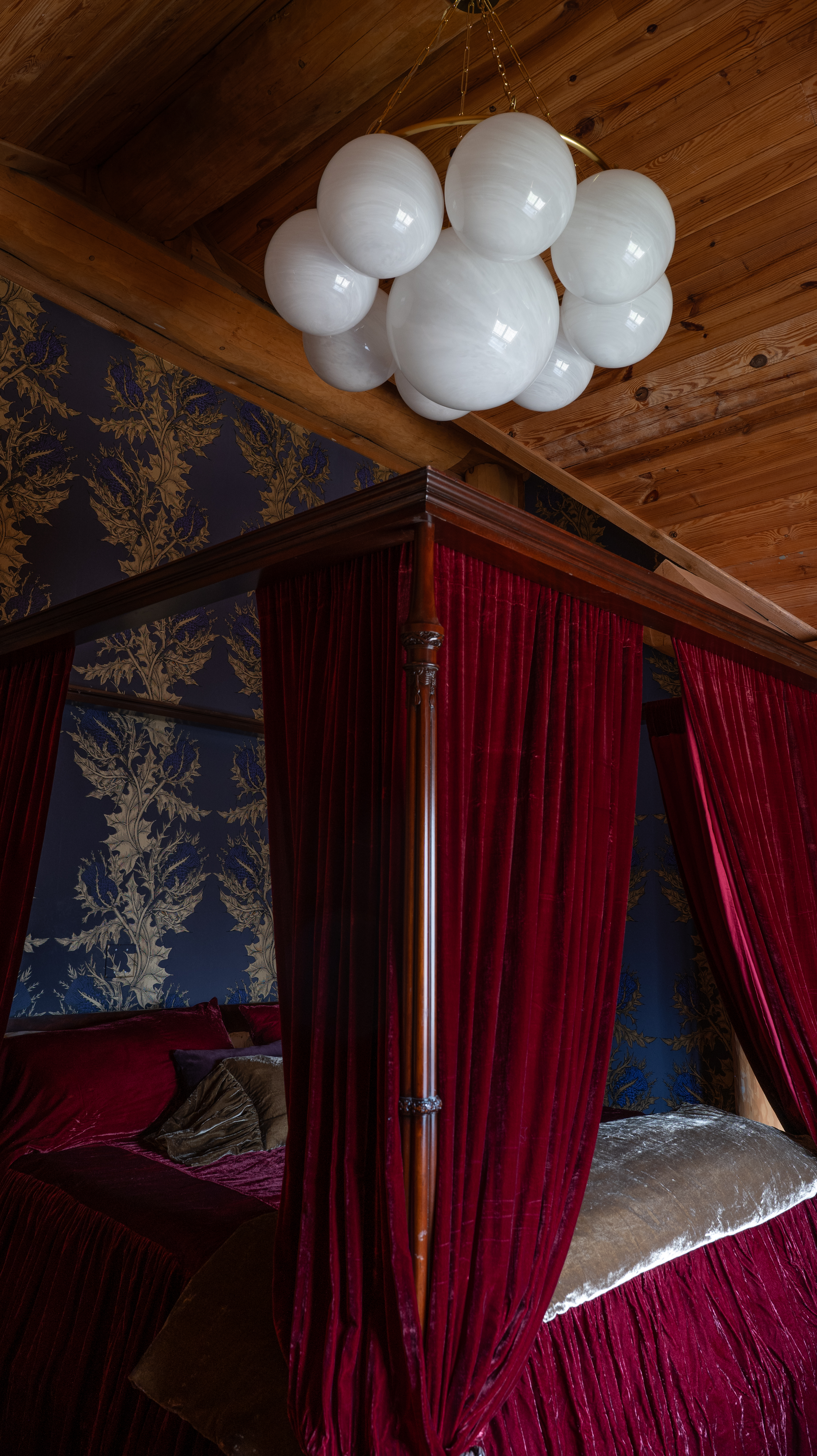 Make a statement on the ceiling with this gorgeous chandelier. Cloud glass globes are arrayed around a larger glass globe at the center creating a silhouette that is stunning whether viewed from across the room or directly underneath. The cloud glass has a wispy, natural feel and the Aged Brass framework and chain detailing add more warmth to this light and airy showstopper.