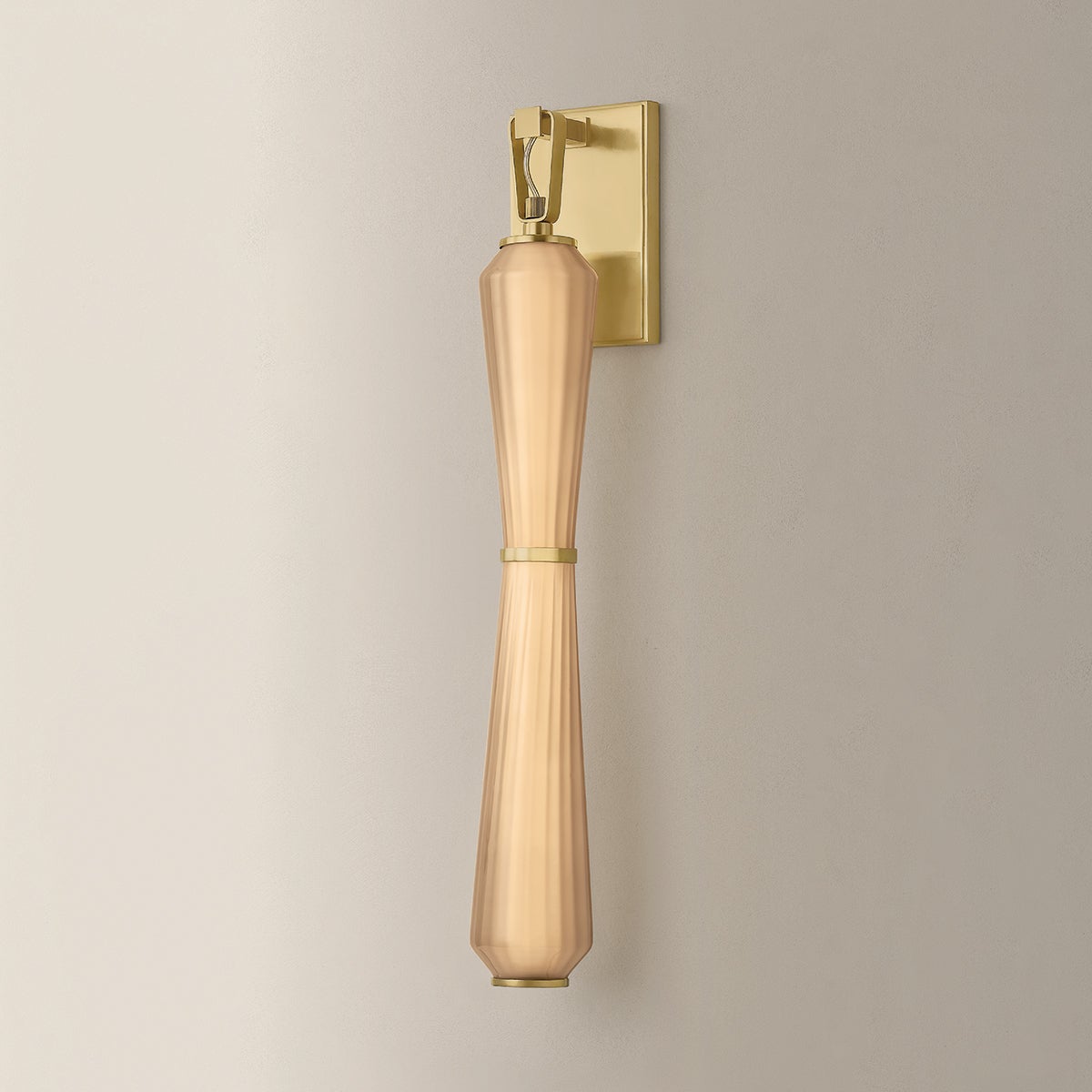 The gem-inspired Zircon dazzles with charm. This single-light sconce is distinguished by an elongated shade that tapers in at the center like a slender hourglass. Etched light bronze glass lends a moody, romantic look, accompanied by a Vintage Brass finish on the metalwork. Nodding to the shape of the shade, a decorative loop suspends the fixture at the top like a dangling earring. The backplate serves as a frame for this jewel, catching the eye as it reflects light.