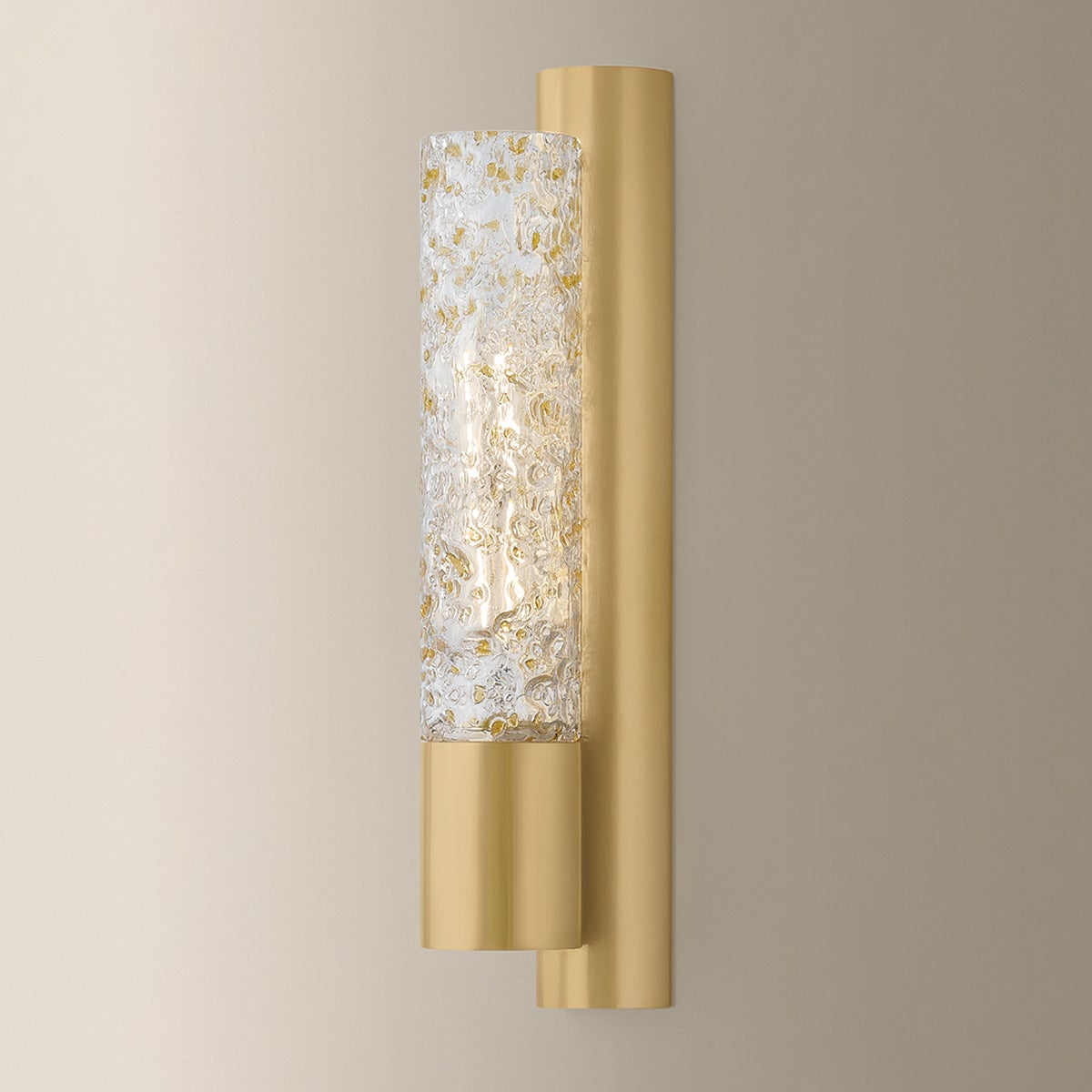 Rich in texture, yet minimalist in silhouette, the Ivalo sconce pairs a tube shade with specialty glass. Accented by delicate golden-amber specks, the Doria glass appears effervescent when lit. A sleek Vintage Brass-finished backplate and cuff add shine to the fixture. In either its single or double light formats, Ivalo makes for a highly useful, style-forward wall light.