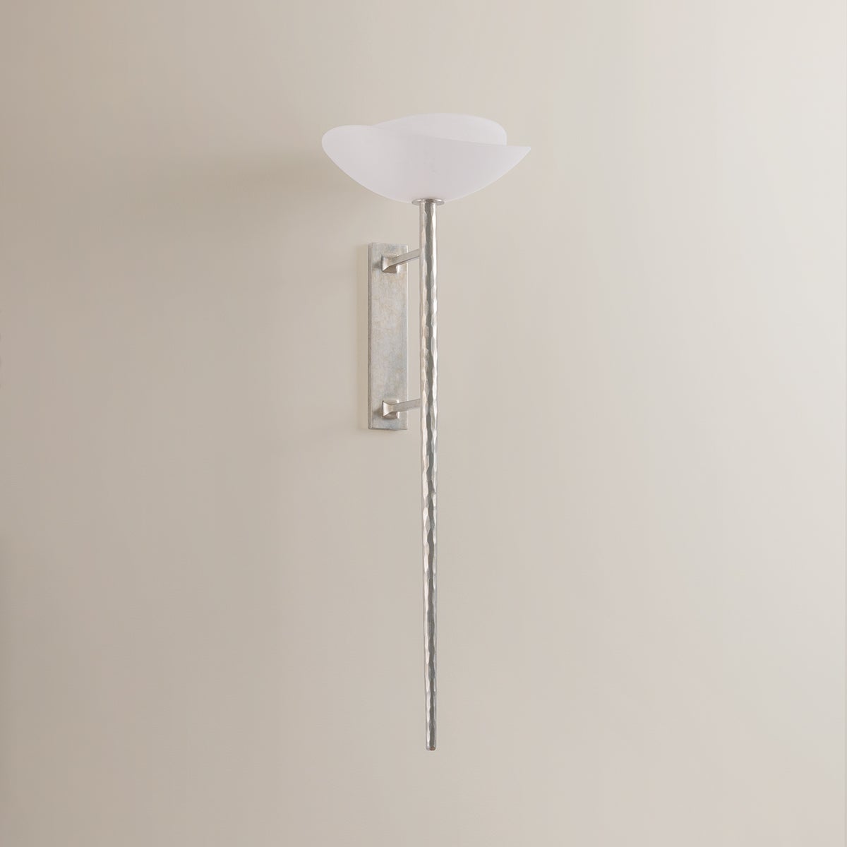 Coppa is a quiet study in the layering of light. A softly domed, concentric matte cloud seedy glass shade recalls the shape of a blooming flower, casting a gentle uplight that feels both dimensional and refined. Its elongated, textured brass stem—finished in either Vintage Gold Leaf or Warm Silver Leaf—spans 33.25 inches, bringing graceful drama and a touch of tailored elegance to the wall. Coppa delivers a luminous glow that’s at once structured and soft—sculptural and undeniably romantic.