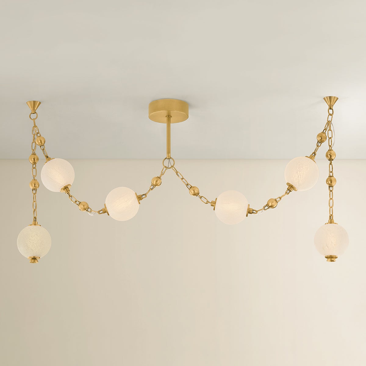 Corda draws inspiration from the elegance of heirloom jewelry—where light becomes adornment, and structure tells a story. Hand-blown matte cloud glass spheres are suspended from gleaming Vintage Brass chains, accented by delicate ball chain details, evoking the richness of layered pearl and charm necklaces. Available as a 2-light sconce, a 6-light linear, and a dramatic 12-light chandelier, Corda’s layered suspension system allows for customizable hanging methods, introducing an unexpected sense of movement and personalization. It brings a sense of intimacy and ornament to a space, casting a warm, glamorous glow that is both delicate and intentional.
