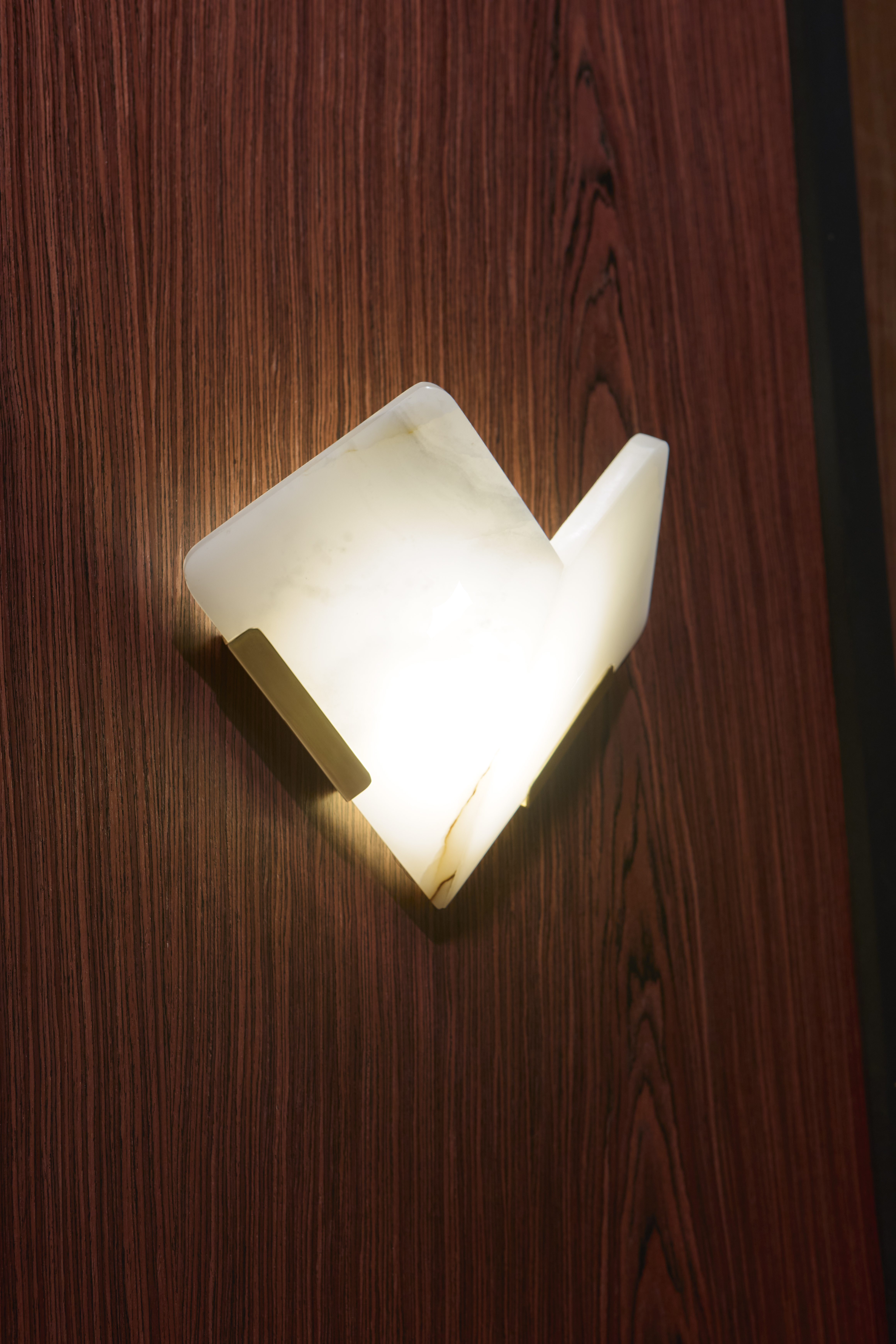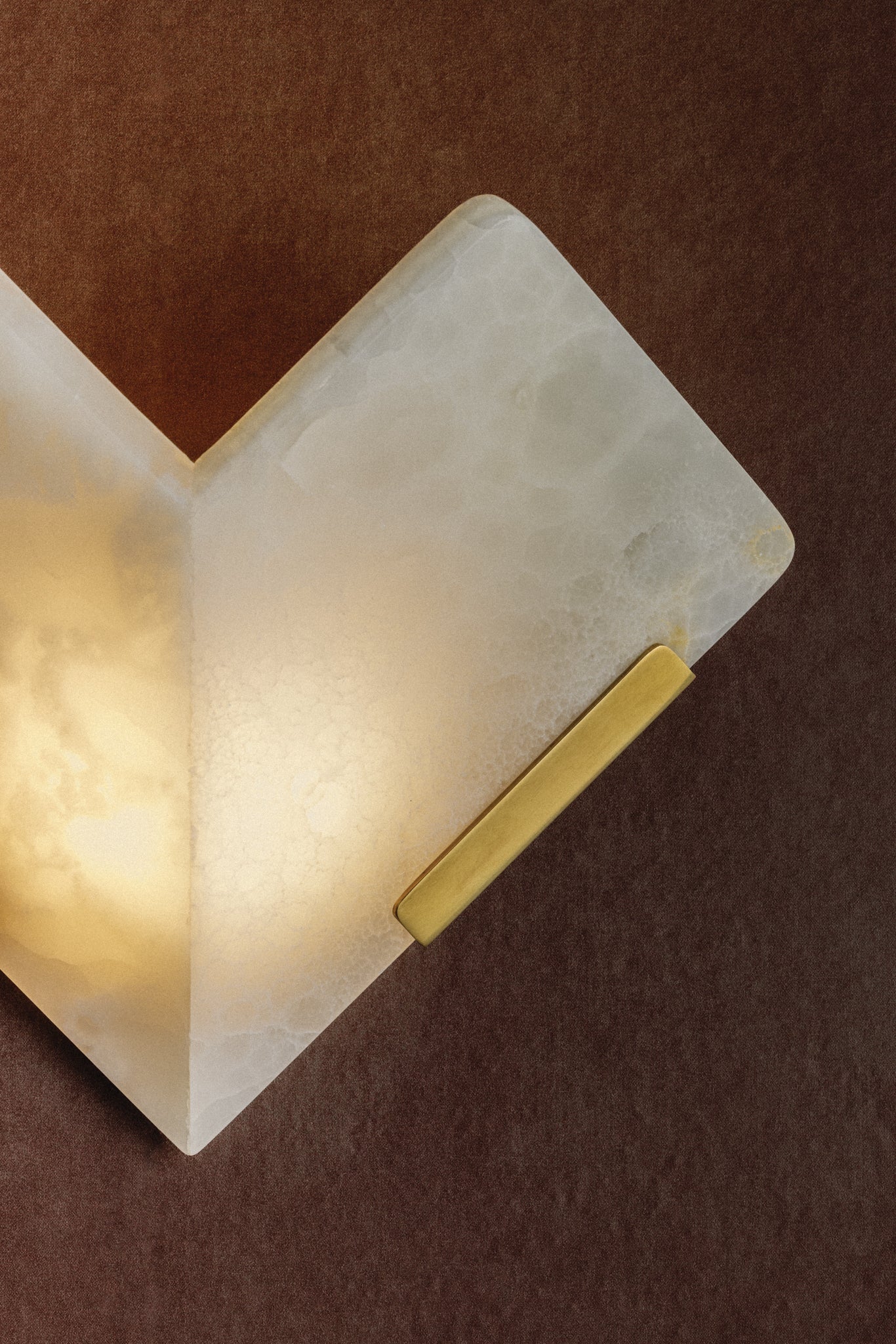 Geo is defined by its quiet strength and sculptural clarity. Glowing panels of honey onyx are book matched to reveal mirrored veining—an artisanal detail more often seen in luxury surfaces than lighting. The symmetry of the stone takes center stage, framed by clean, minimal metalwork in Vintage Brass that amplifies its natural elegance. Available as a 1-light wall sconce in two shapes and sizes, as well as a 1-light flush mount, Geo offers a soft, grounded glow that feels both bold and restrained. Its graphic silhouette and elemental beauty lend structure and visual rhythm to interiors.