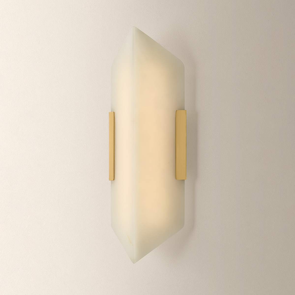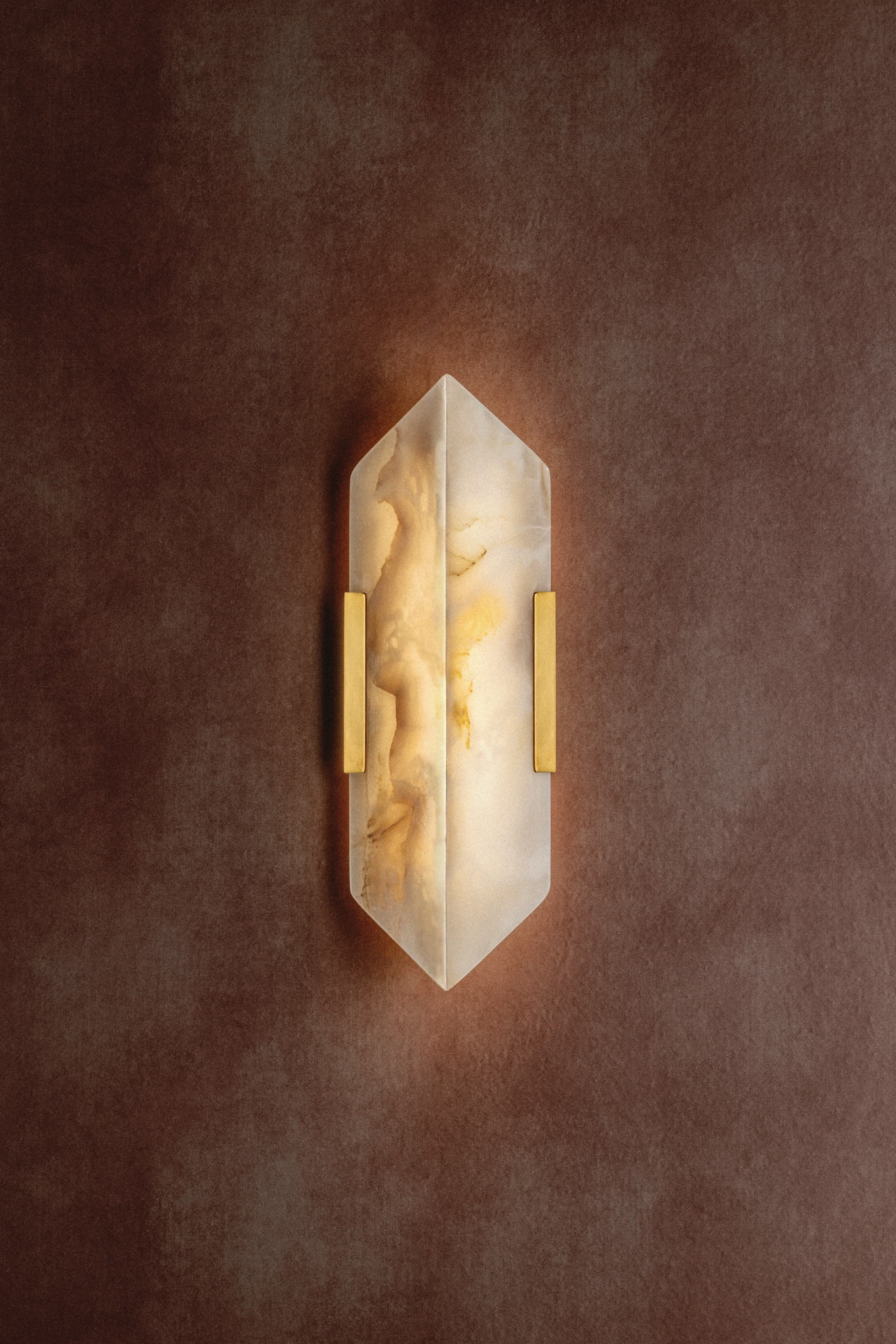 Geo is defined by its quiet strength and sculptural clarity. Glowing panels of honey onyx are book matched to reveal mirrored veining—an artisanal detail more often seen in luxury surfaces than lighting. The symmetry of the stone takes center stage, framed by clean, minimal metalwork in Vintage Brass that amplifies its natural elegance. Available as a 1-light wall sconce in two shapes and sizes, as well as a 1-light flush mount, Geo offers a soft, grounded glow that feels both bold and restrained. Its graphic silhouette and elemental beauty lend structure and visual rhythm to interiors.