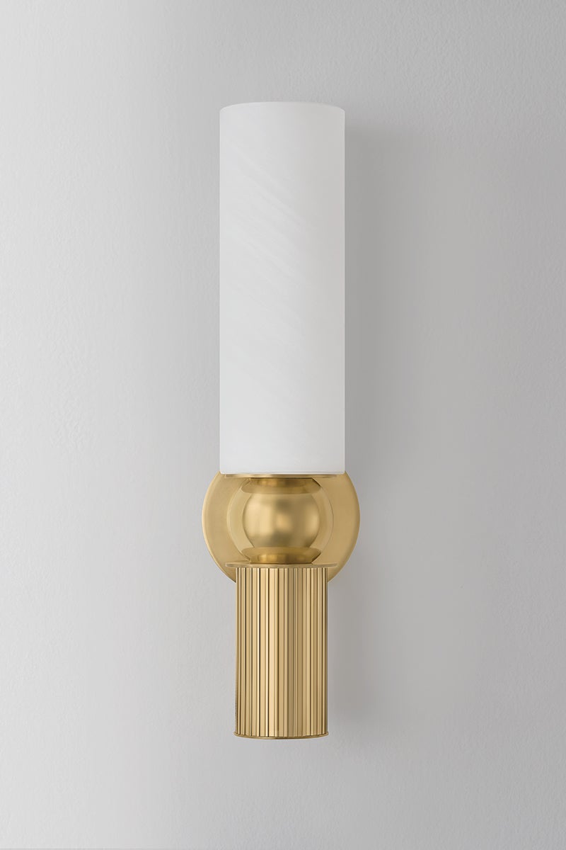 Inspired by classical architecture, the Ronda sconce recalls a Greek column with soft curves and uniform fluting. A matte cloud glass shade diffuses ambient light above, while a hidden light source within the metal cylinder casts a focused glow below. To complement the antique aesthetic, Ronda is finished in Vintage Brass.