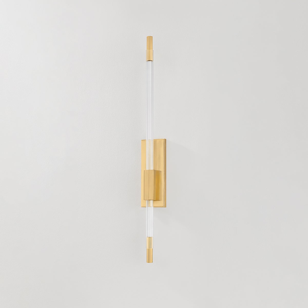 Clean lines, transparent layers, and sleek metalwork define this modern sconce. Exploring an innovative lighting technique, Rosco features a thin edge-lit acrylic rod inside an extruded glass tube. Creating a remarkably slim overall silhouette, this double-layer of diffusion emits a warm light output. Designed as a bath sconce, Rosco is finished with classic Aged Brass hardware.