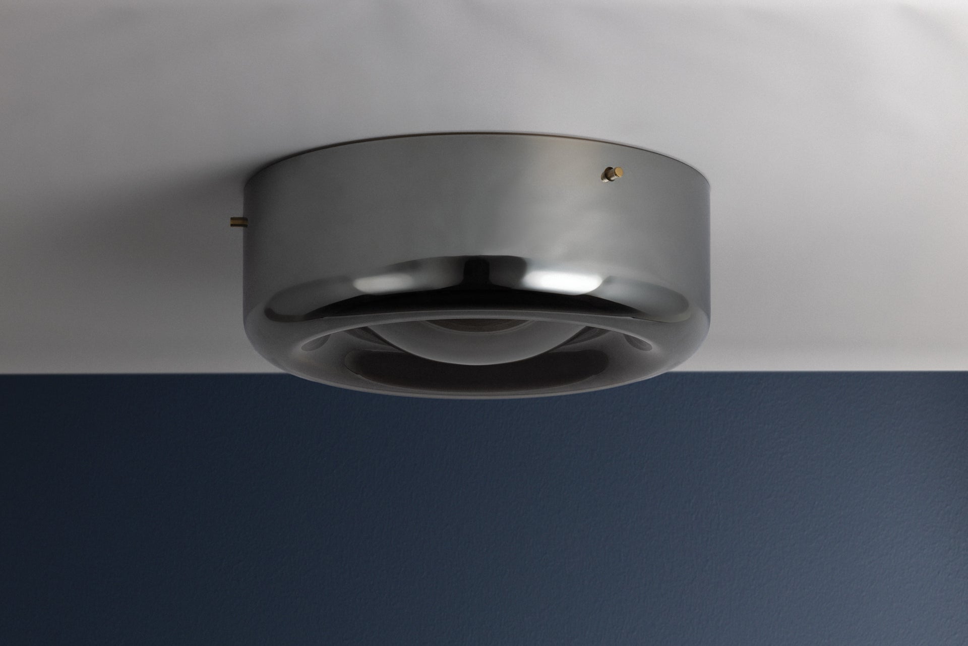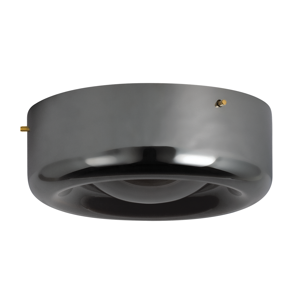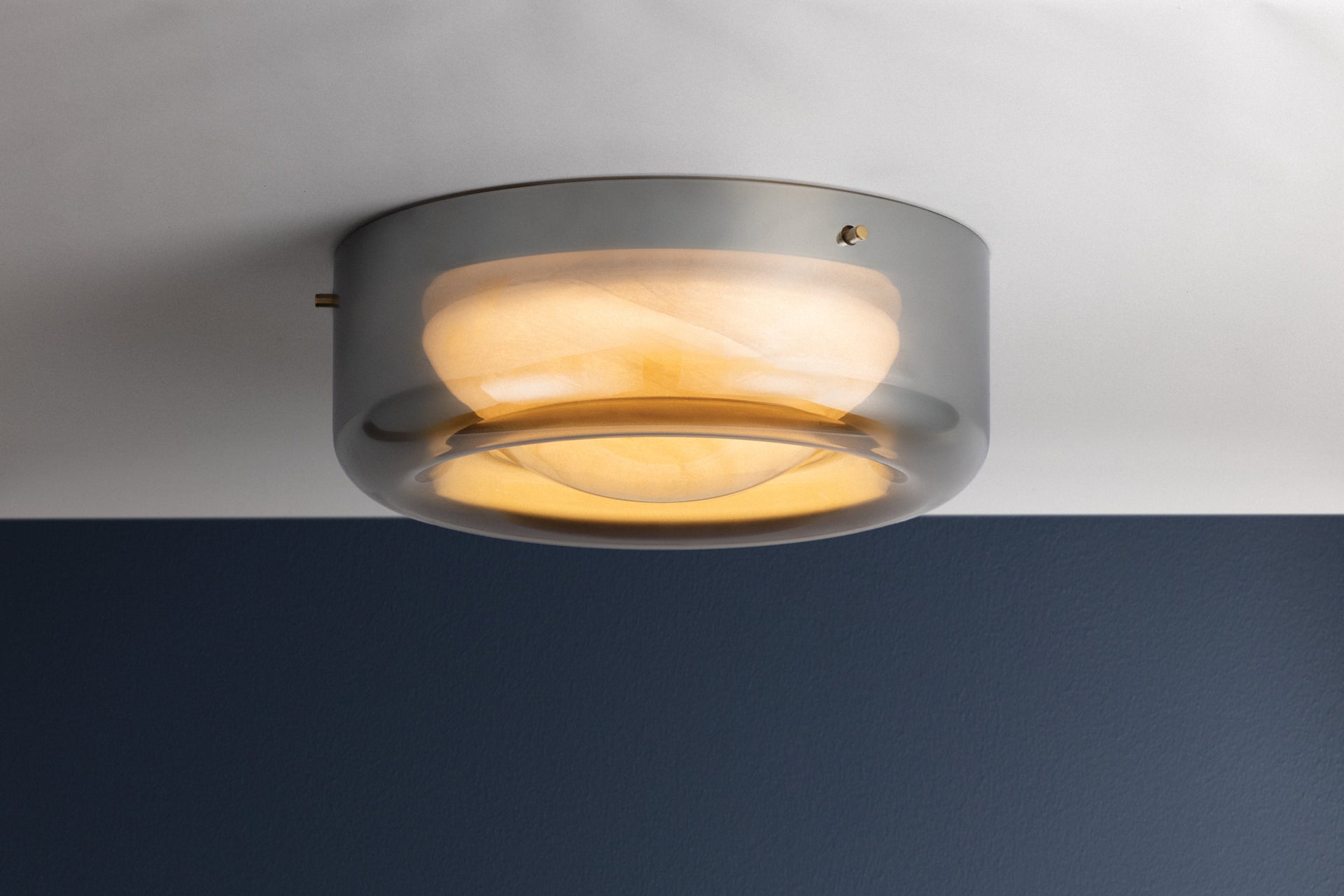The Eldred semi flush mount brings drama to the ceiling with its dimpled form and layered glass design. An inner shade of swirling cappuccino glass is encased in a darker outer layer of moody dark smoke glass, creating a multi-dimensional glow. An Aged Brass-finished backplate frames Eldred as it emits ambient light without the harsh glare.