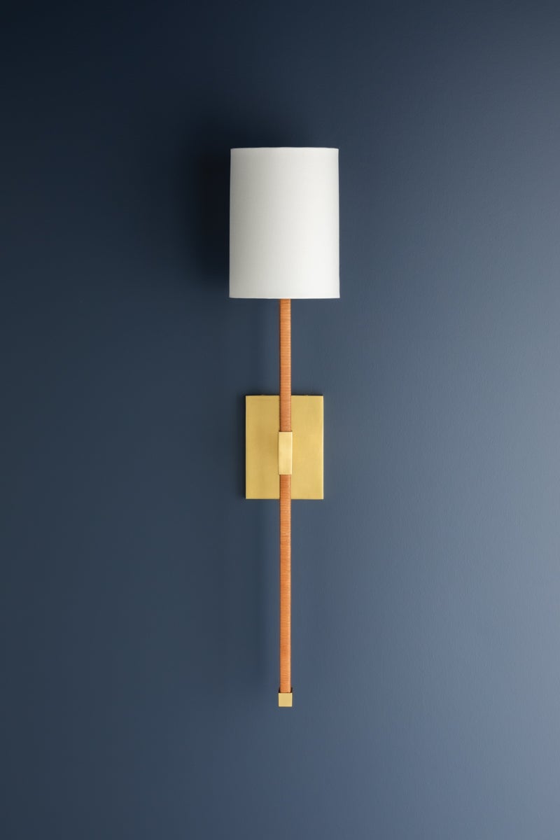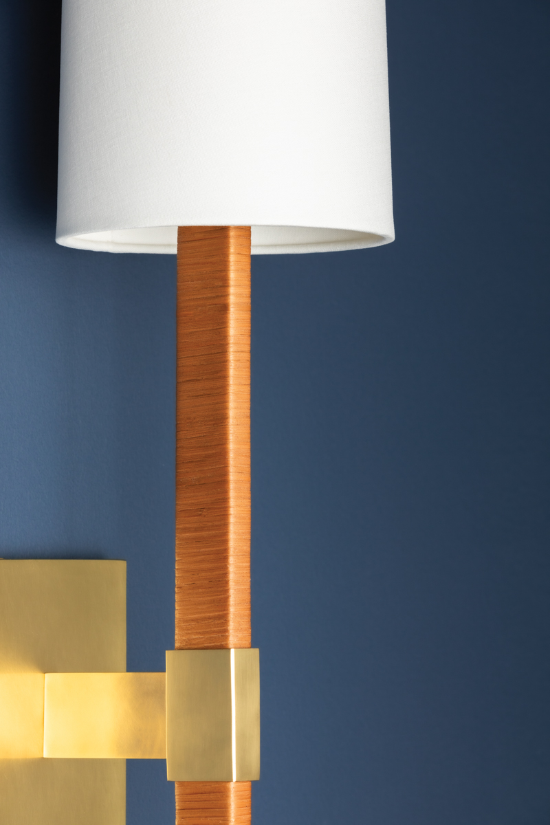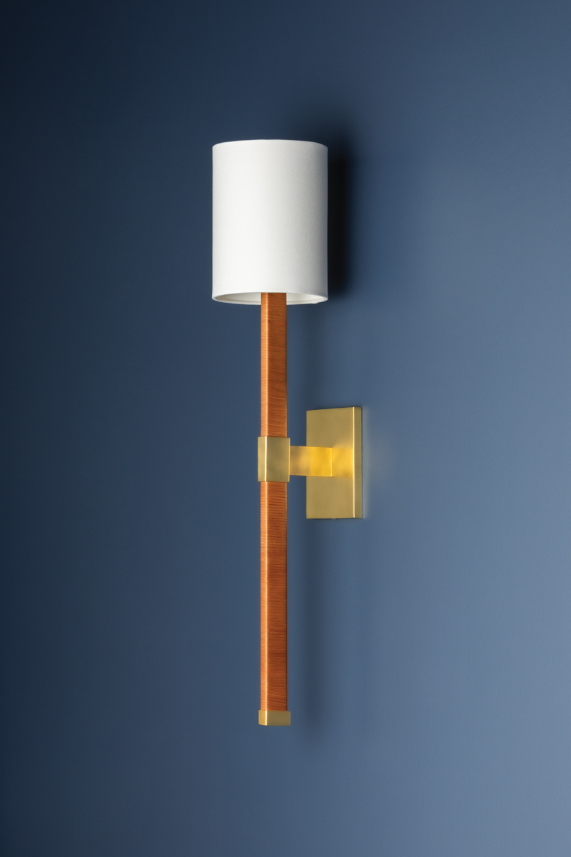 Minnetonka balances rectangular profiles in its armature with the softer natural qualities of linen and rattan wrap for an artful yet understandable silhouette. The Aged Brass backplate and accents create a refined counterpoint to the rustic textures. This distinctive blend of materials, coupled with Minnetonka’s elongated torch shape, hints at a nautical influence.