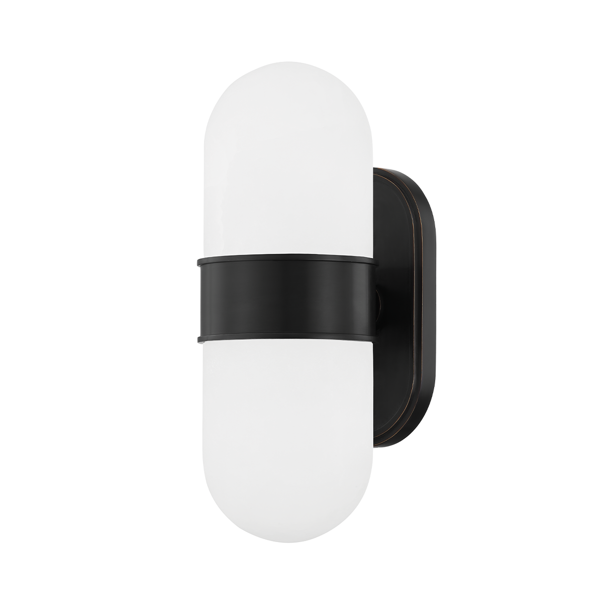 A pair of alabaster shades are held in place by a beveled metal band giving Beckler a clean, sleek look that brings sophistication to any space. The large oval backplate has a matching beveled design and can be mounted horizontally or vertically. Choose from Aged Brass, Old Bronze or Polished Nickel finishes.
