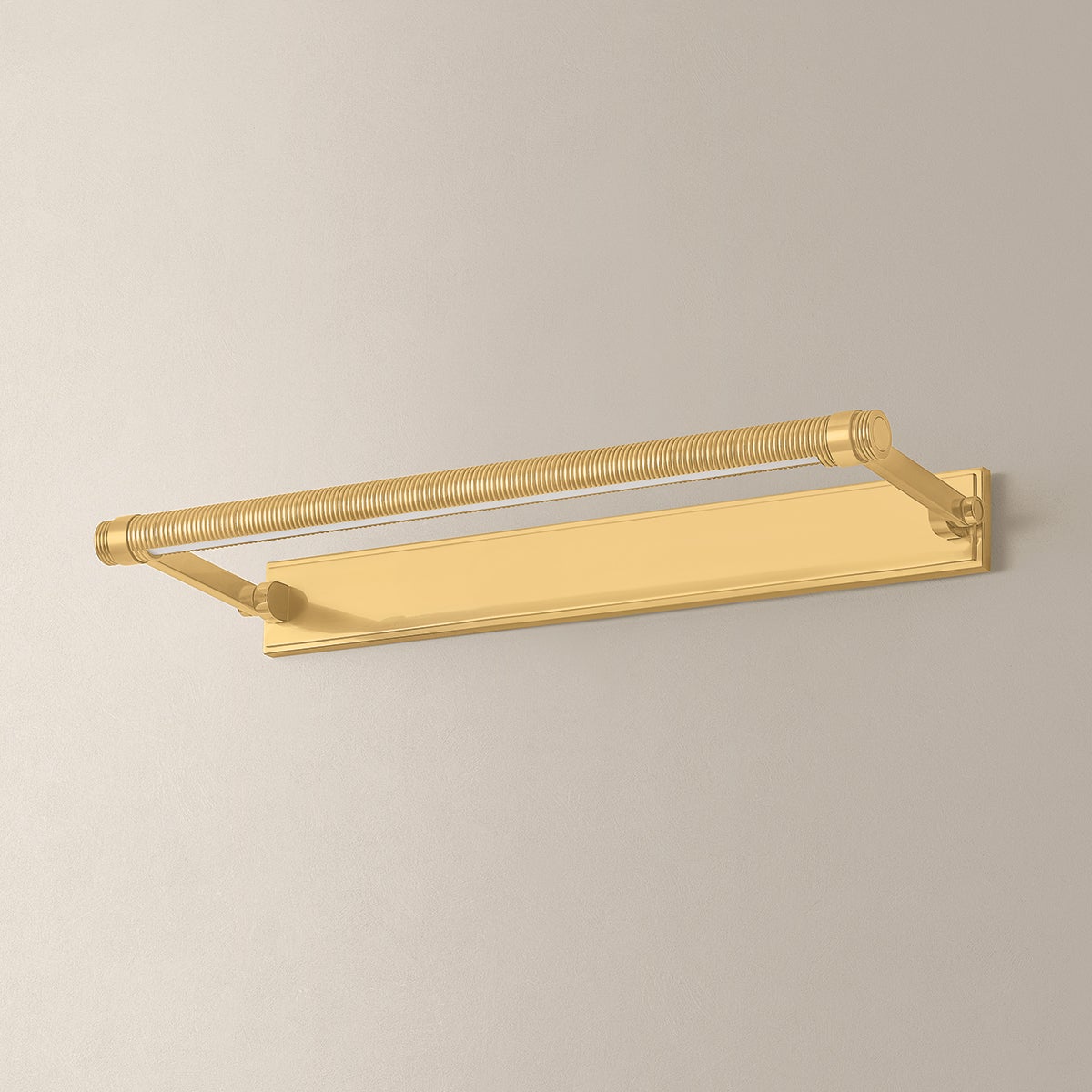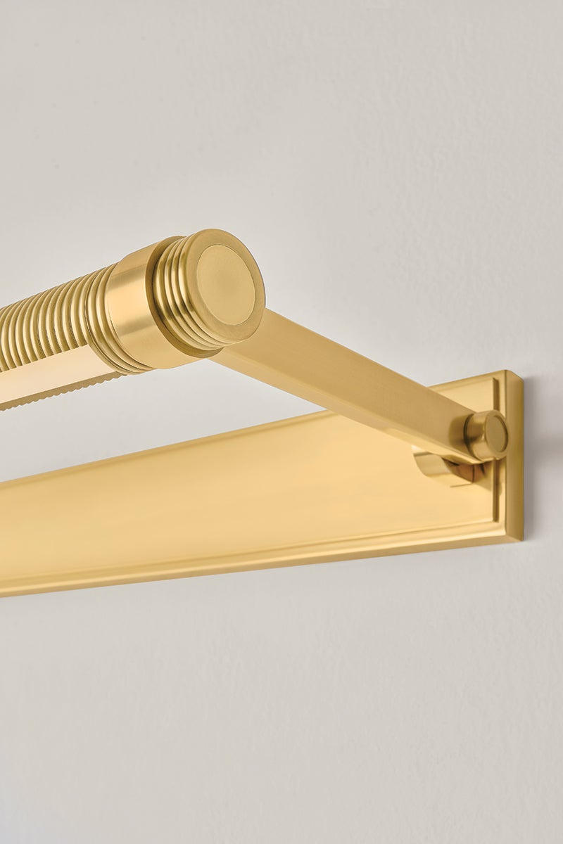 An industrial take on a classic picture light, Duell adds fine knurling to a clean-lined cylindrical shade. While the slender profile and streamlined backplate allow Duell to blend into any space, the oversized brackets and rectangular armbacks introduce architectural interest. Duell is available in three sizes and two finish options: an all-over Aged Brass or Distressed Bronze with Aged Brass accents.