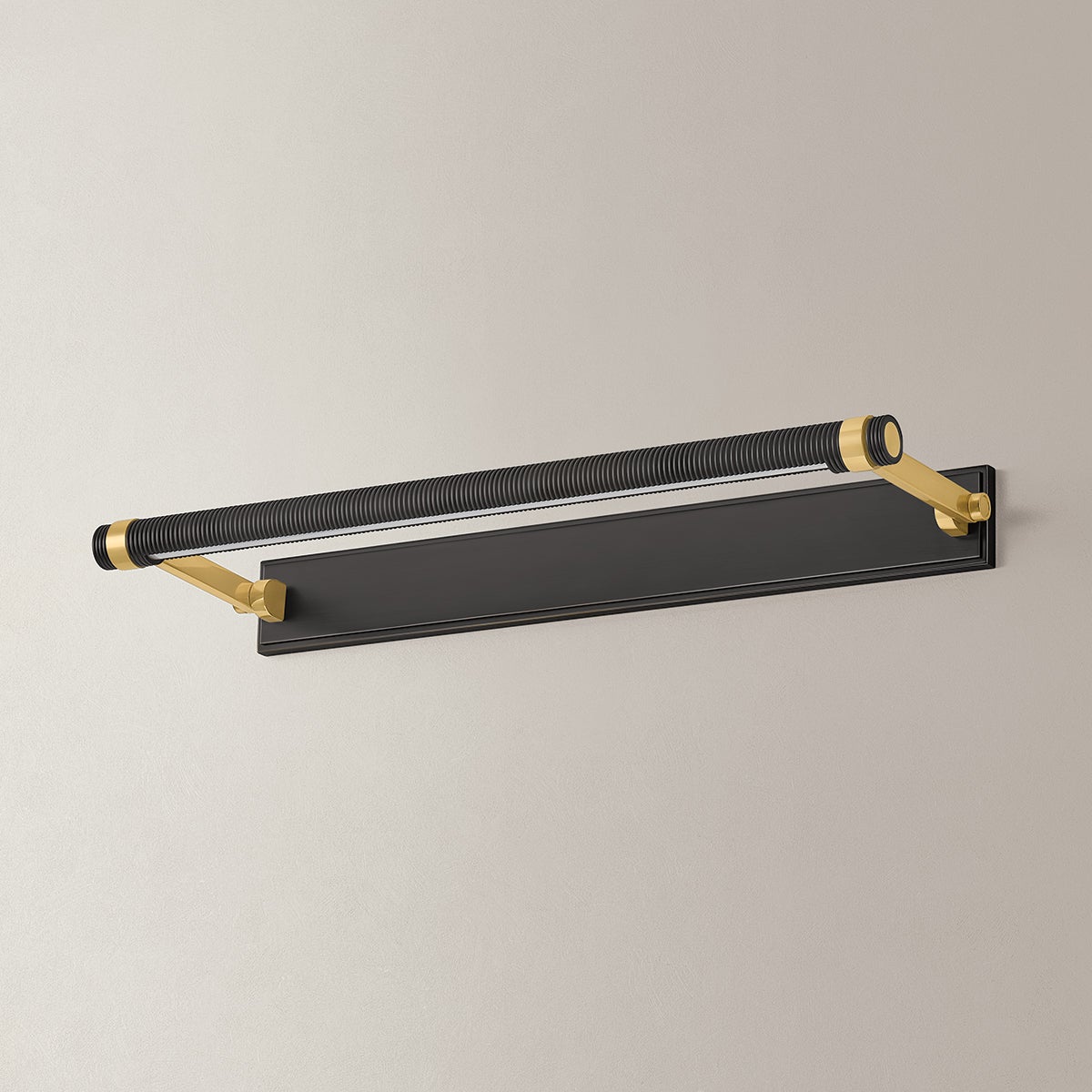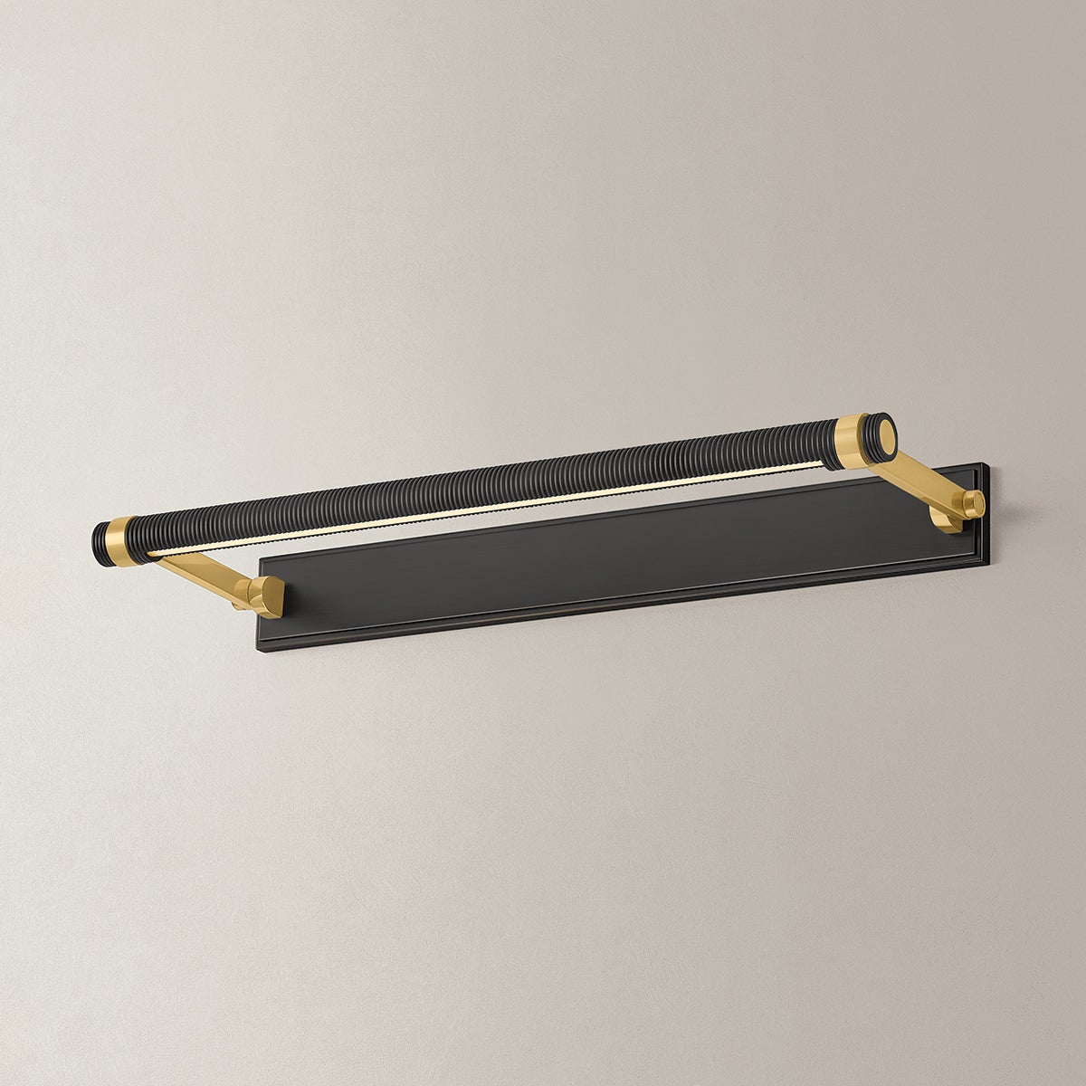 An industrial take on a classic picture light, Duell adds fine knurling to a clean-lined cylindrical shade. While the slender profile and streamlined backplate allow Duell to blend into any space, the oversized brackets and rectangular armbacks introduce architectural interest. Duell is available in three sizes and two finish options: an all-over Aged Brass or Distressed Bronze with Aged Brass accents.