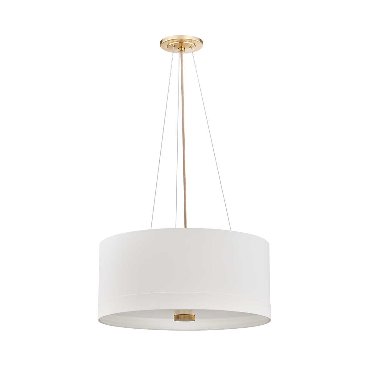 The Ashland family reimagines a modern drum silhouette with oversized proportions and polished details. A white linen shade is complemented by an Aged Brass-finished canopy and finial. Fitted into the shade, an etched glass diffuser provides a soft, even glow around a large space. With two sizes of flush mount and two pendant options, Ashland is a crisp, timeless solution for an entryway, dining area, or living room.