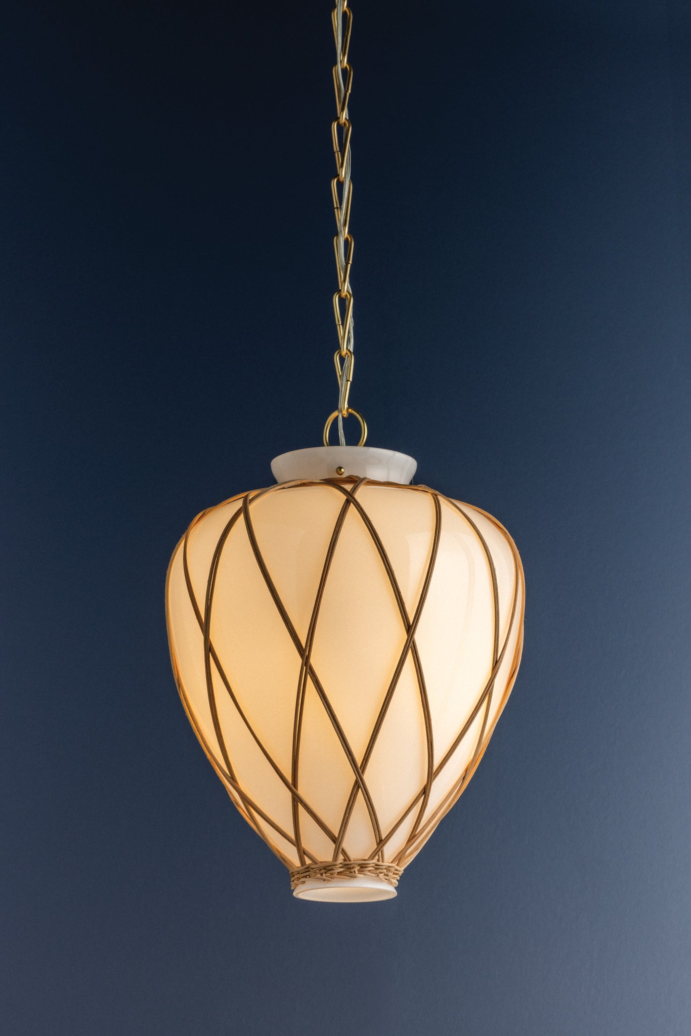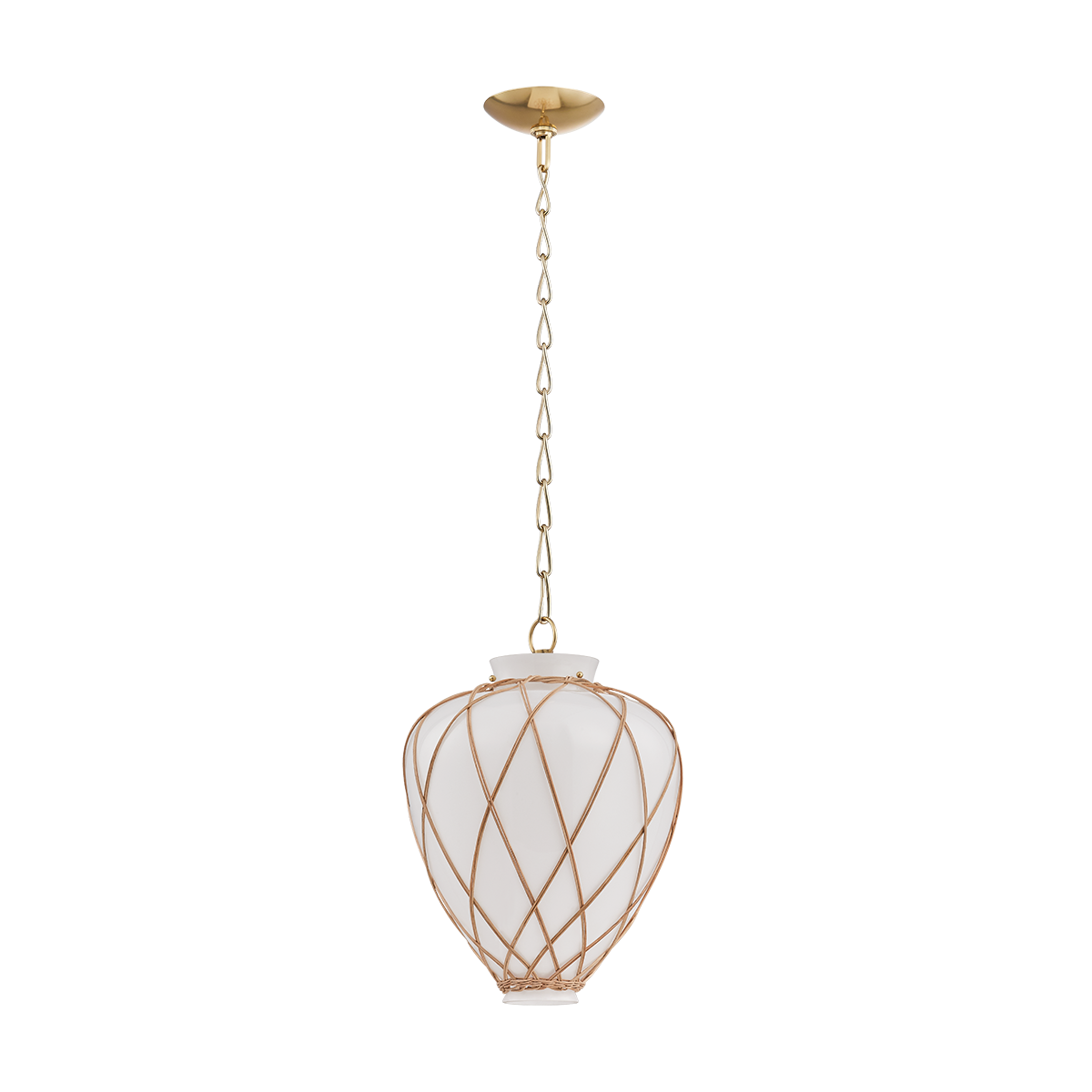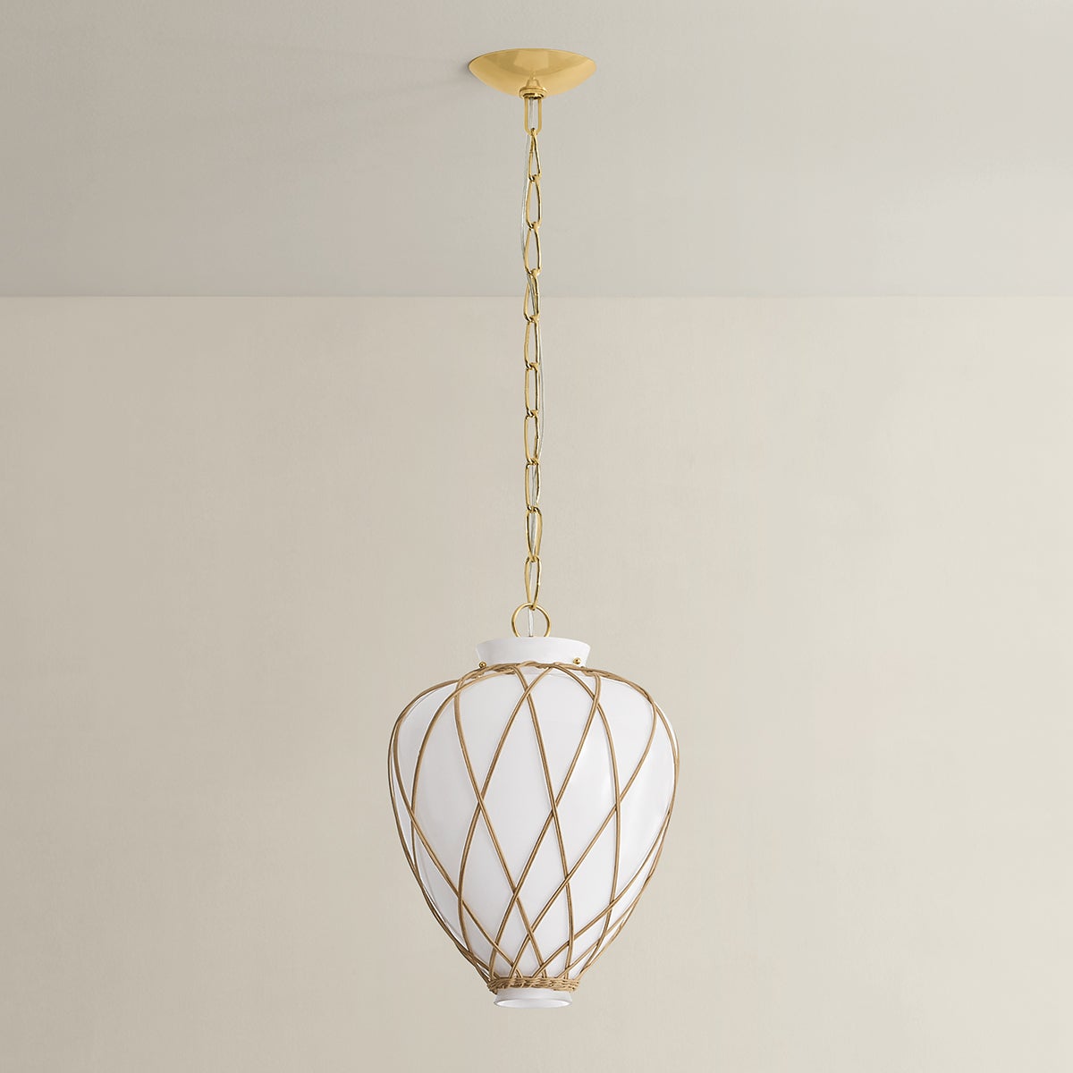 A latticework rattan cage wraps around the glass urn-shaped shade of the Apple Valley pendant, creating a textural, net-like effect. Pairing translucent opal glossy glass and rattan results in an intriguing play of light on the surfaces surrounding this lantern-like silhouette. An Aged Brass-finished chain and small rivets support the fixture, adding a polished note. Available in 13” and 17” sizes.
