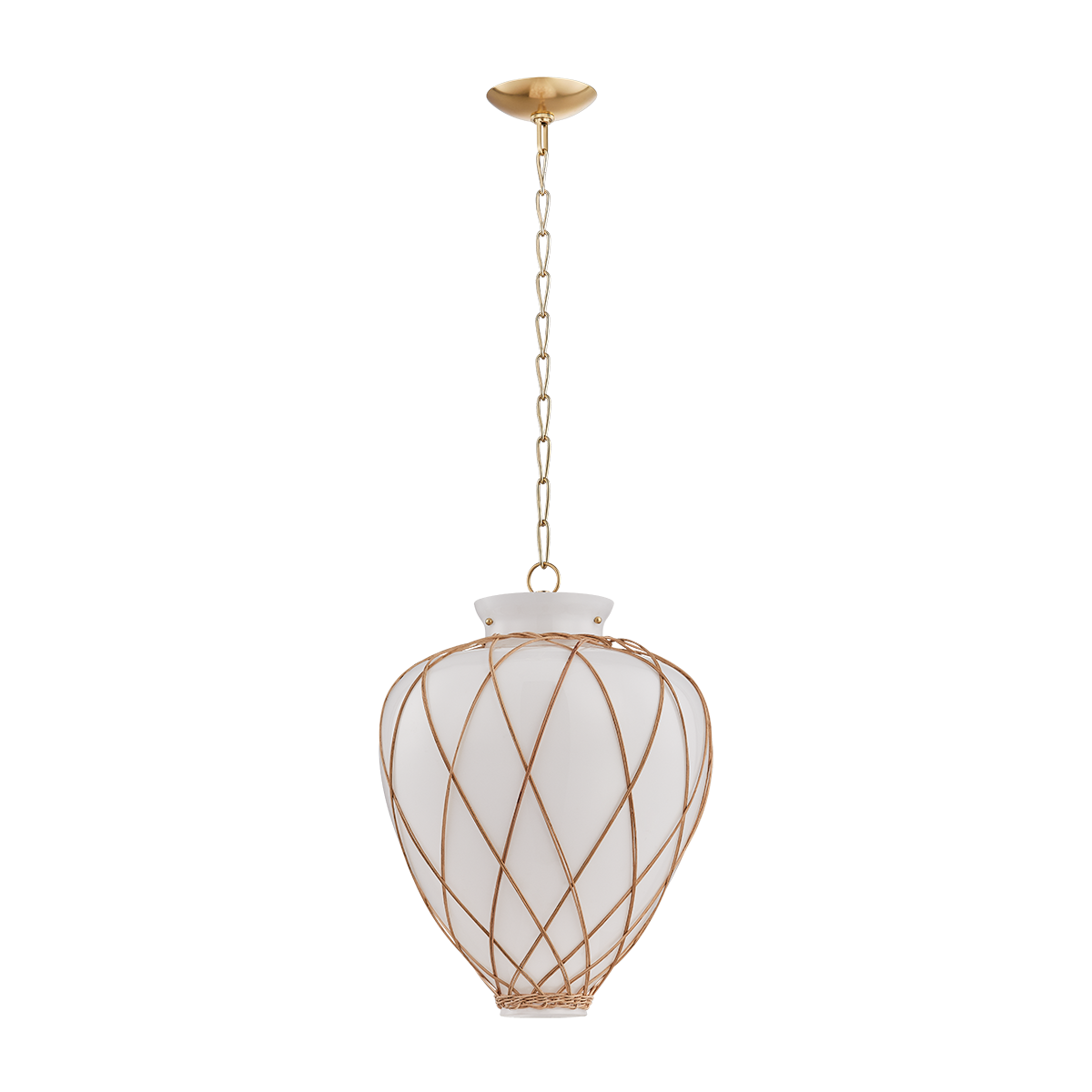 A latticework rattan cage wraps around the glass urn-shaped shade of the Apple Valley pendant, creating a textural, net-like effect. Pairing translucent opal glossy glass and rattan results in an intriguing play of light on the surfaces surrounding this lantern-like silhouette. An Aged Brass-finished chain and small rivets support the fixture, adding a polished note. Available in 13” and 17” sizes.