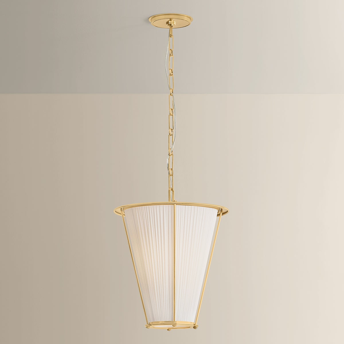 Drawing inspiration from a vintage lantern, Ellsworth presents a refined reinterpretation defined by material contrast and elevated scale. An elegantly pleated silk shade sits within a structured Aged Brass frame, striking a balance between softness and strength. Slender vertical rods, ornamental rivets, and a looped chain detail add tailored embellishment. Available in two sizes, Ellsworth brings a sense of clarity and sophistication to any space.