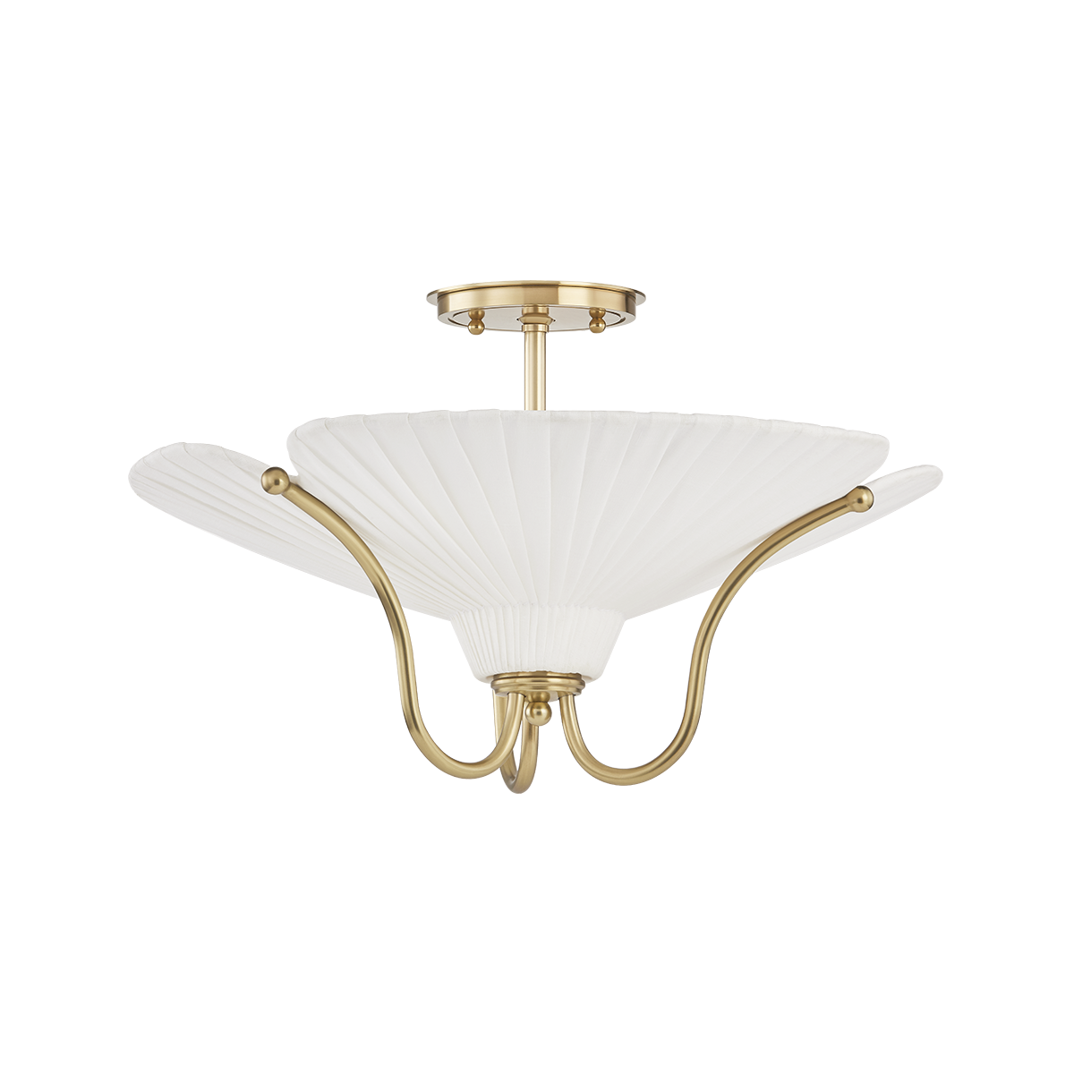 Drawing inspiration from the organic elegance of the Art Nouveau period, Gerhard reinterprets floral motifs with architectural clarity. Gracefully arched metalwork in a warm Aged Brass finish supports sheer ivory linen shades, crafted with a unique pleating technique that adds volume and dimension. Together, these elements form abstracted botanical shapes that feel both refined and expressive. Available as a semi flush mount and a 3 or 9-light pendant, this decorative up light serves as a captivating, sculptural focal point.