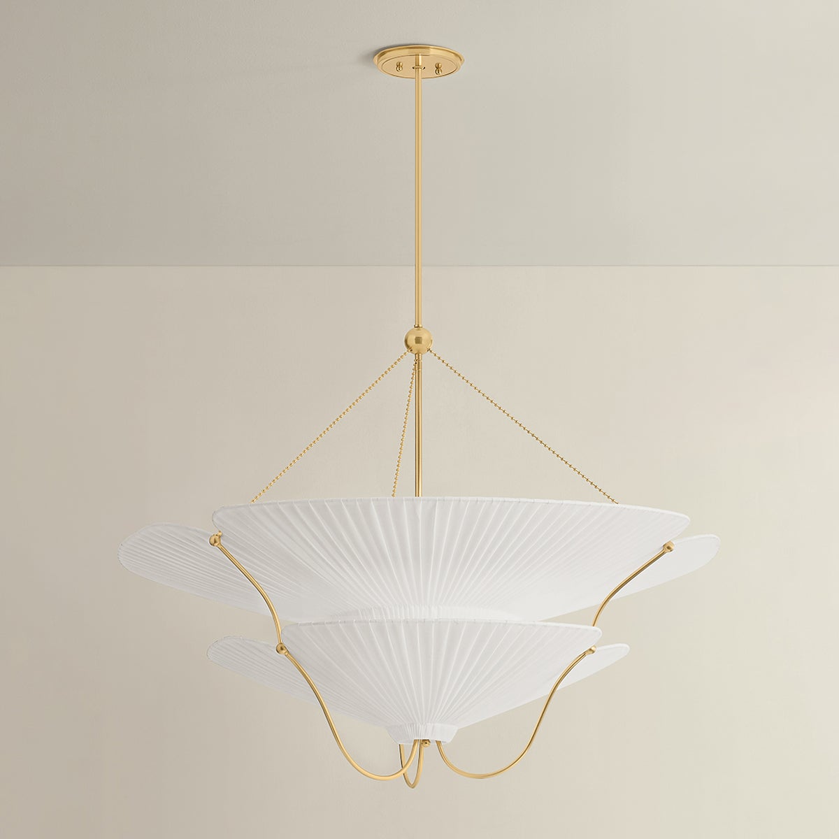 Drawing inspiration from the organic elegance of the Art Nouveau period, Gerhard reinterprets floral motifs with architectural clarity. Gracefully arched metalwork in a warm Aged Brass finish supports sheer ivory linen shades, crafted with a unique pleating technique that adds volume and dimension. Together, these elements form abstracted botanical shapes that feel both refined and expressive. Available as a semi flush mount and a 3 or 9-light pendant, this decorative up light serves as a captivating, sculptural focal point.