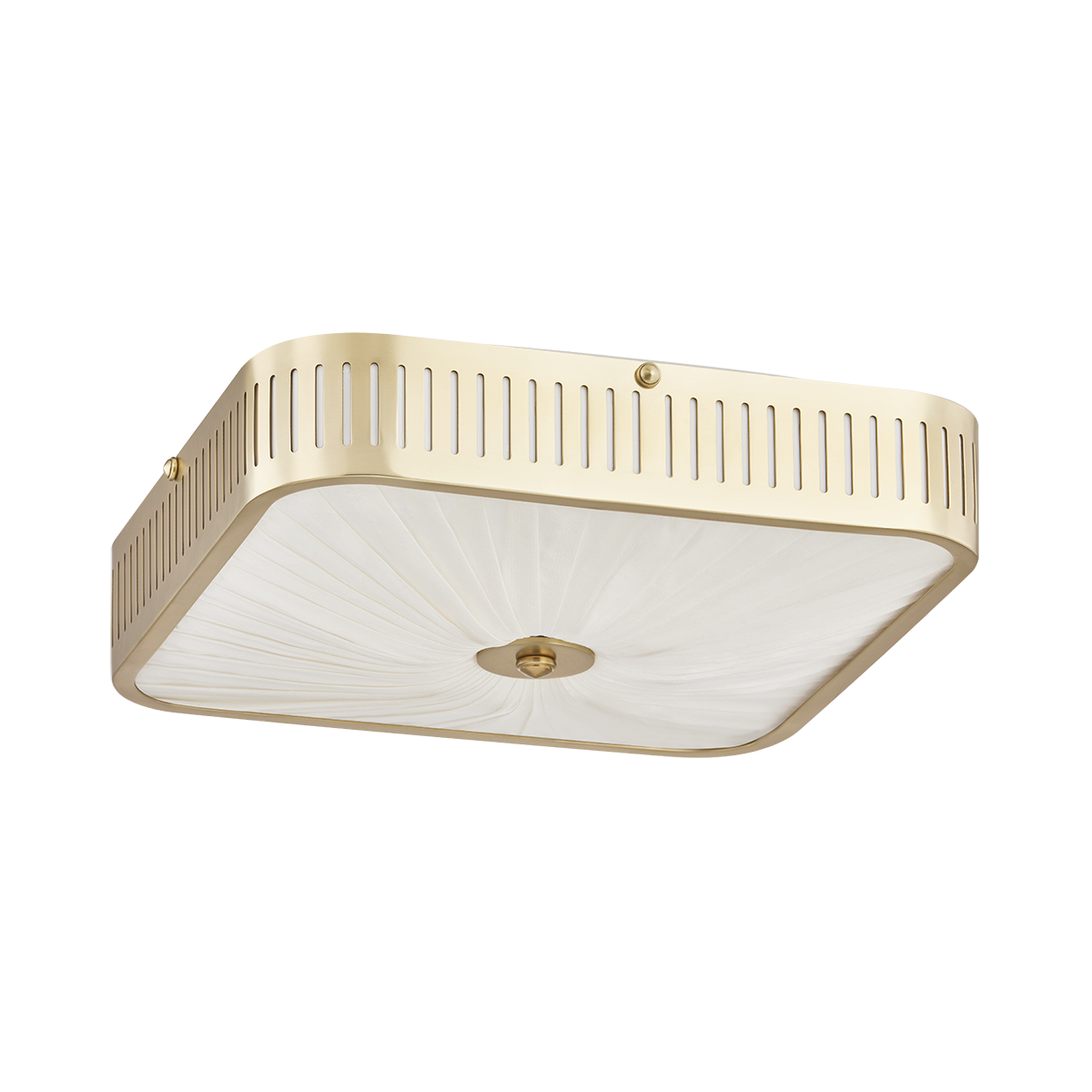 Henri reimagines the classic flush mount with a sculptural edge and purposeful detailing. A shallow square frame in Aged Brass features uniform perforations that offer both visual texture and functional ventilation. The pleated silk shade lends a refined softness, creating a warm glow that complements the fixture’s clean architectural lines. Available in 4- or 6-light options, Henri is an ideal solution for lower ceilings—bringing elevated design to even the most compact spaces.