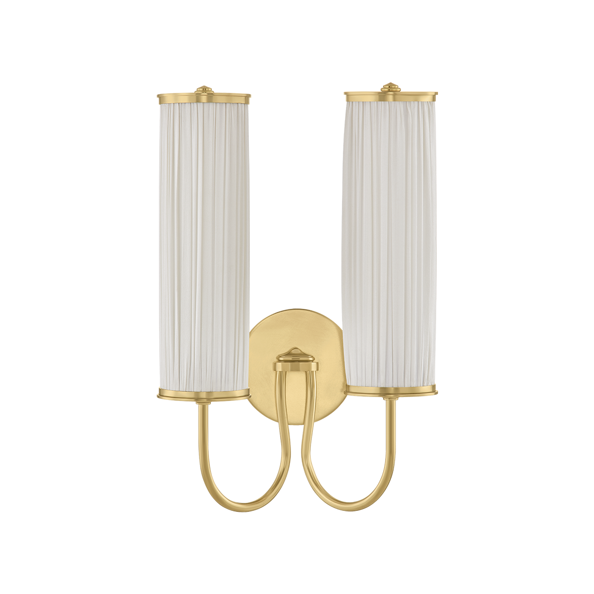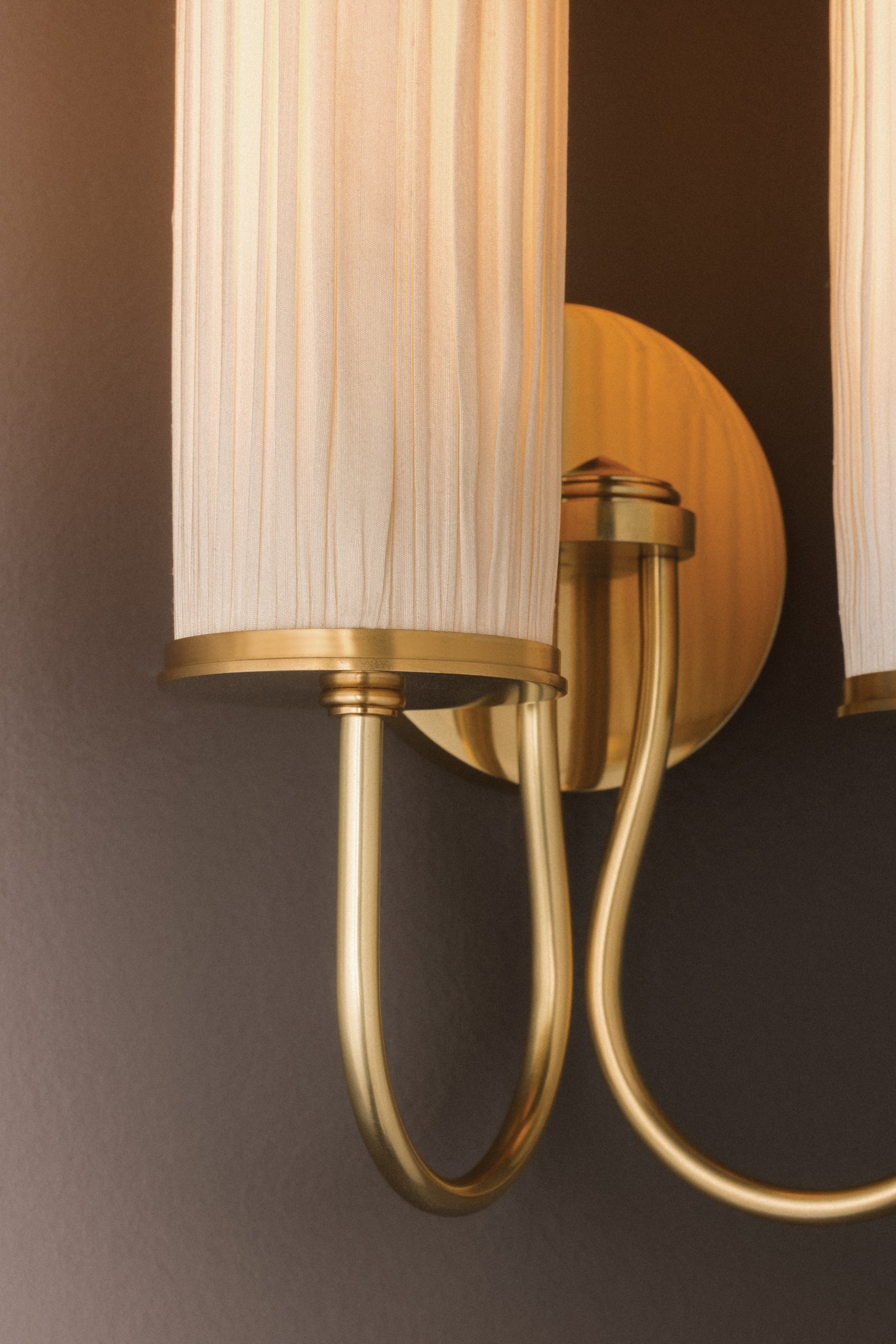 Elaine is a petite, elegant fixture that brings quiet sophistication to any setting. A gathered silk shade with even pleating diffuses light beautifully, while gently swooping Aged Brass metalwork introduces softness and sculptural fluidity. Whether used as a decorative accent or subtle task lighting, Elaine enhances moments of transition between spaces, offering a refined sense of continuity. Available as a 2-light vertical sconce or a 2-light picture light, this versatile form brings layered nuance to interiors.