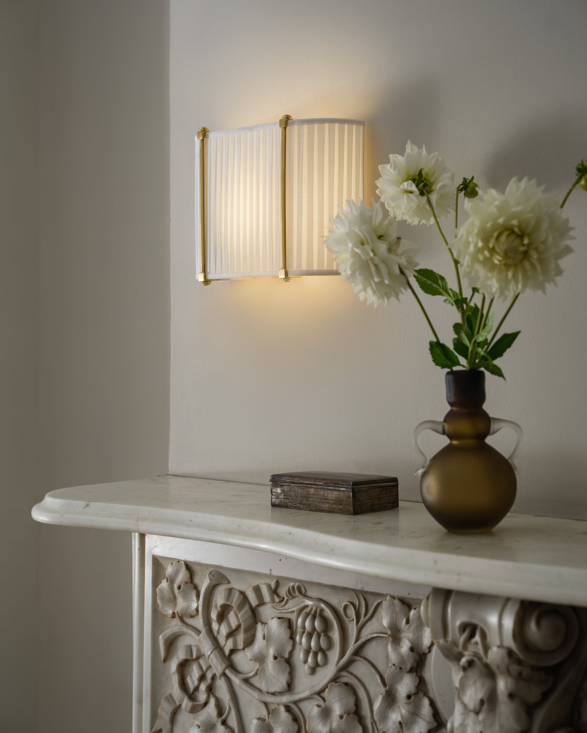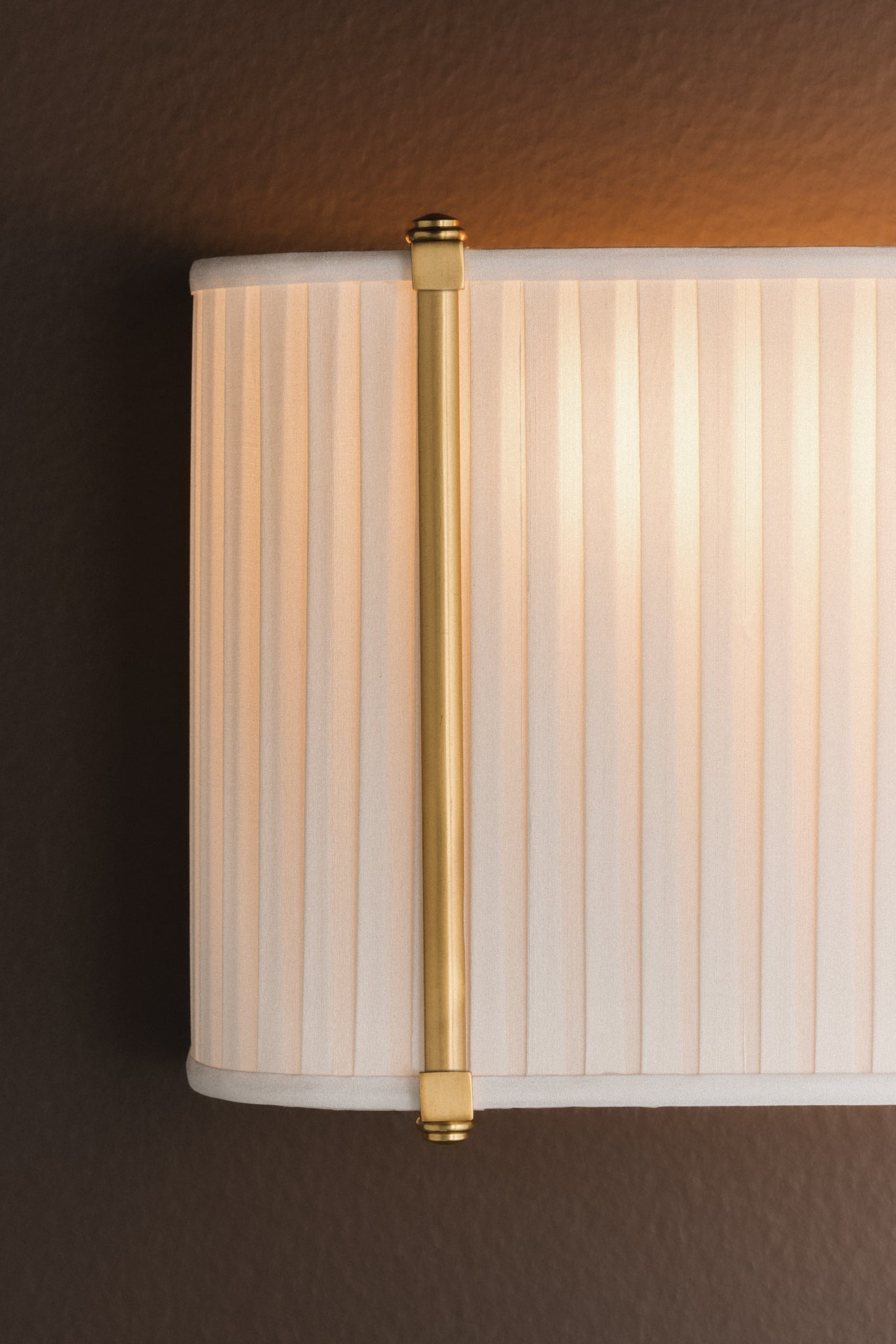 Cornell strikes a graceful balance between softness and structure. A hand-pleated silk shade is framed by slender vertical rods in an Aged Brass finish, creating a streamlined silhouette with vintage appeal. Offered in two sizes—a narrow 2-light and a wider 2-light version—Cornell’s quiet elegance and tailored proportions make it an ideal layering piece for transitional moments throughout the home.