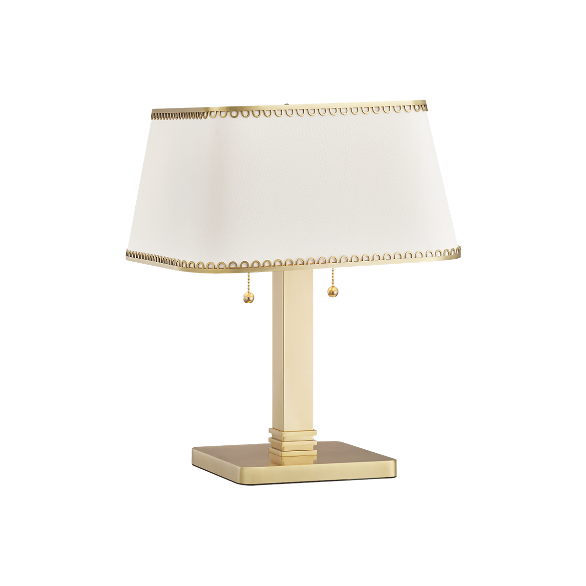 Claude brings sculptural presence to a compact form, pairing a crisp, tailored silhouette with refined, vintage-inspired detailing. A square raw silk shade is delicately edged with lace-like metal perforations—an unexpected interplay of softness and structure. The Aged Brass finish, decorative pull chain, and twisted fabric cord evoke a sense of nostalgic charm with a modern sensibility.
