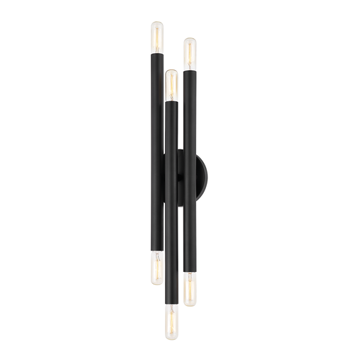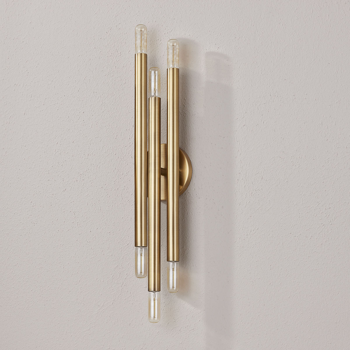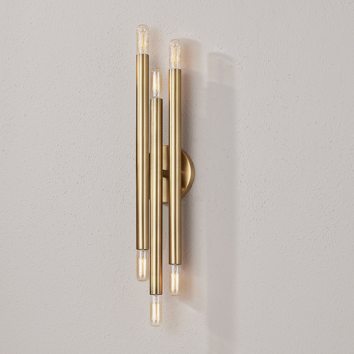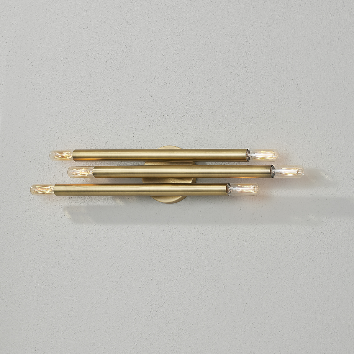 Streamlined, cylindrical metal shades are mounted at varying heights and depths from a circular backplate for a sleek and minimalist take on a mid-century modern silhouette. The variety of finishes (Patina Brass, Bronze and Polished Nickel) complement any interior, with the Polished Nickel working particularly well in a powder room or bath. This versatile six-light wall sconce can be styled horizontally or vertically.