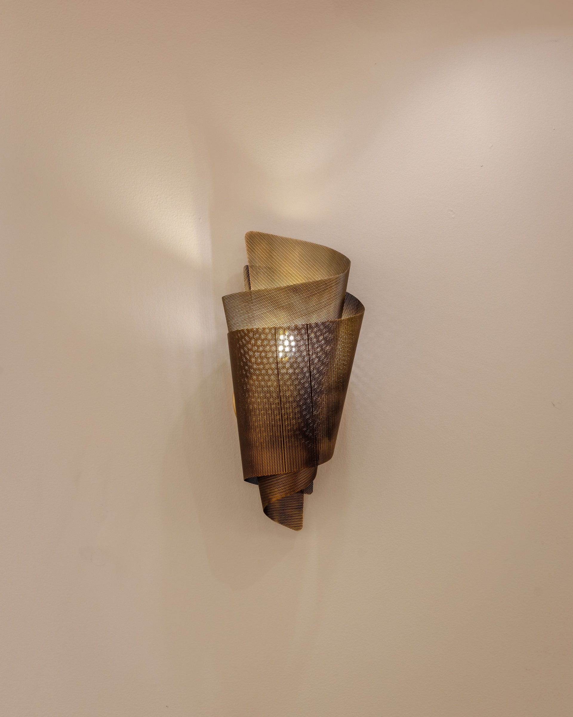 Reminiscent of a roll of wire mesh, the Blaisdell sconce is equally organic and mechanical. Two sheets of fine metal are wrapped together to create a dynamic, cone-shaped silhouette. The fine all-over perforations add texture and allow light to escape from the shape. Finished in Patina Brass, Blaisdell makes an artful statement wherever it is placed.
