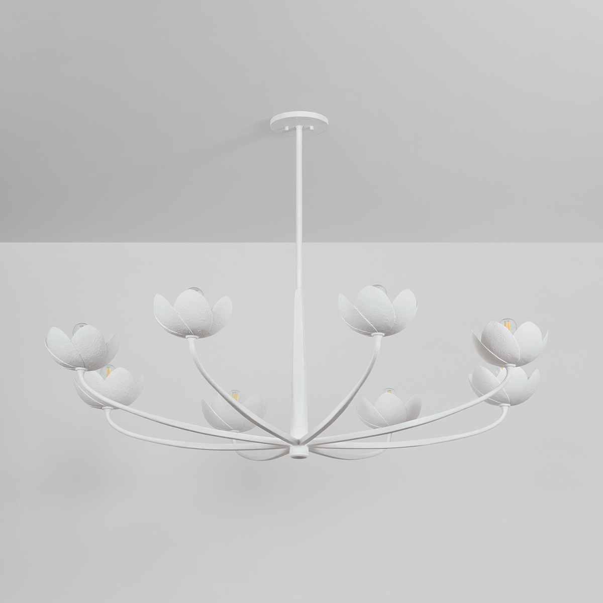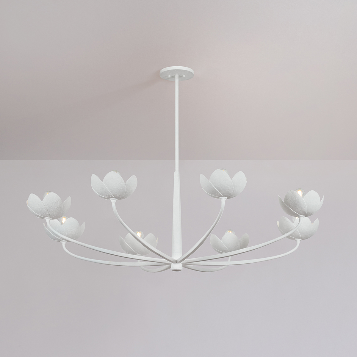 A fresh take on a botanic motif, the Arcata family features sculptural, romantic silhouettes with highly tactile, hand-worked finishes. The gentle sweeping arms transition from square to round, creating a dynamic look that complements the floral forms. Arcata is available as a 1-light sconce and 6 or 8-light chandeliers with the choice between contemporary Gesso White or a luxurious Vintage Gold Leaf finish.