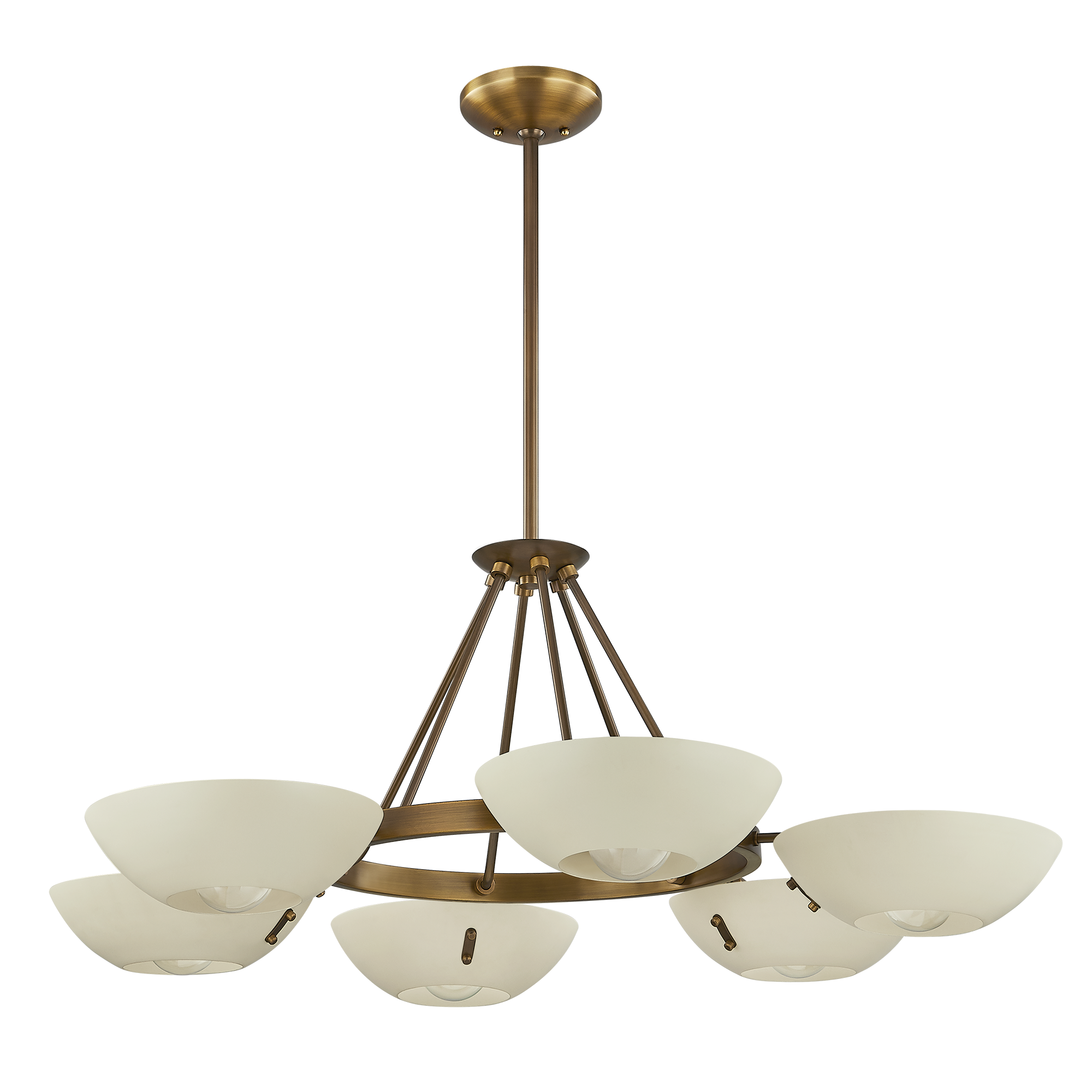 Channeling the spirit of vintage Stilnovo designs, the Alturas chandelier transforms industrial geometry into an artful sensation. A constellation of Soft Sand bowl shades orbit a Patina Brass ring. The clean symmetry provides a striking focal point for living spaces or entryways. Available in two sizes with either 6 or 9 lights.